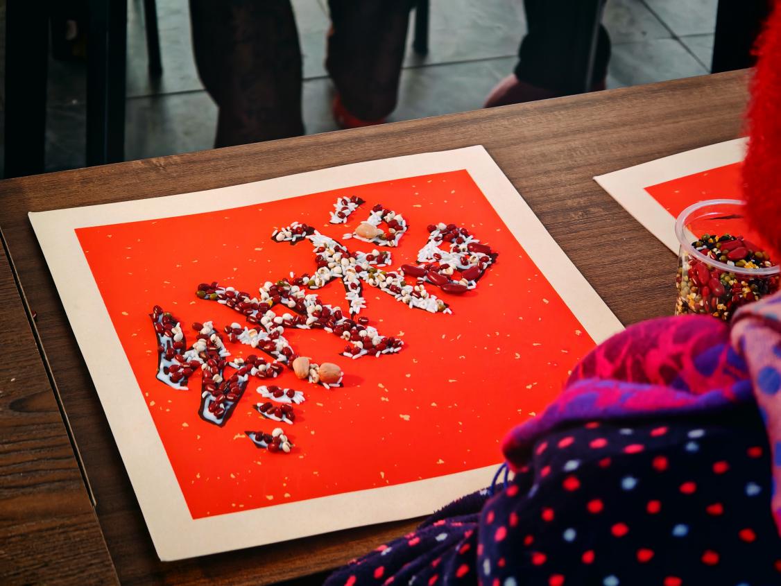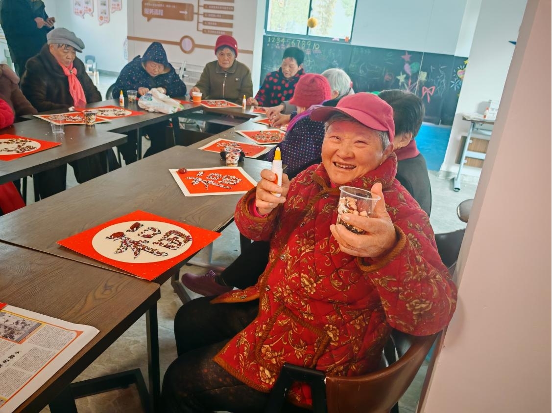 随后,福豆粘制环节开启。工作人员备齐黄、绿、红、黑等各色干豆及画纸、胶水、镊子等工具,还提前整理“福”“纳福”“岁安”等吉祥图纸供选择。老人们围坐桌前,凭生活巧思搭配色彩、调整间距,逐粒粘贴出寓意美好的短句。工作人员穿梭其间,提醒胶水用量、协助视力欠佳的老人,邻里间主动搭手相助,暖意在指尖与话语间流转。
