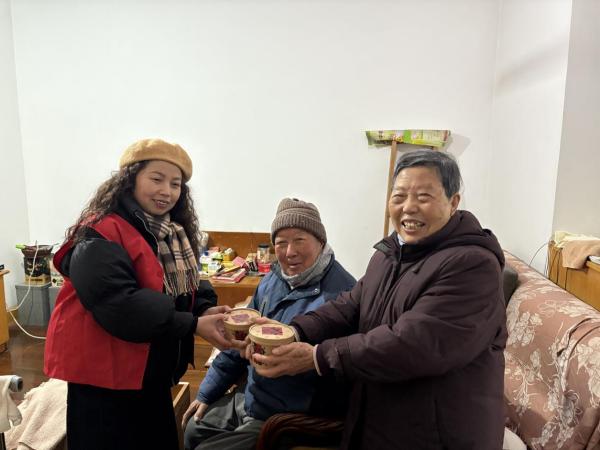 另一组志愿者队伍带着打包好的腊八粥入户走访,重点为辖区内的独居老人、空巢老人送上这份冬日暖意与新春祝福。每到一户,与老人亲切谈心交流,细致询问身体状况与生活需求,耐心叮嘱冬季保暖、用火用电安全常识。“孩子们工作忙,平时就我一个人在家,社区不仅送来了腊八粥,还带来了春联,把年味儿送到我心坎里了,真是太贴心了。”家住龙北小区的独居老人王奶奶紧紧握着志愿者的手,眼眶满是感动。