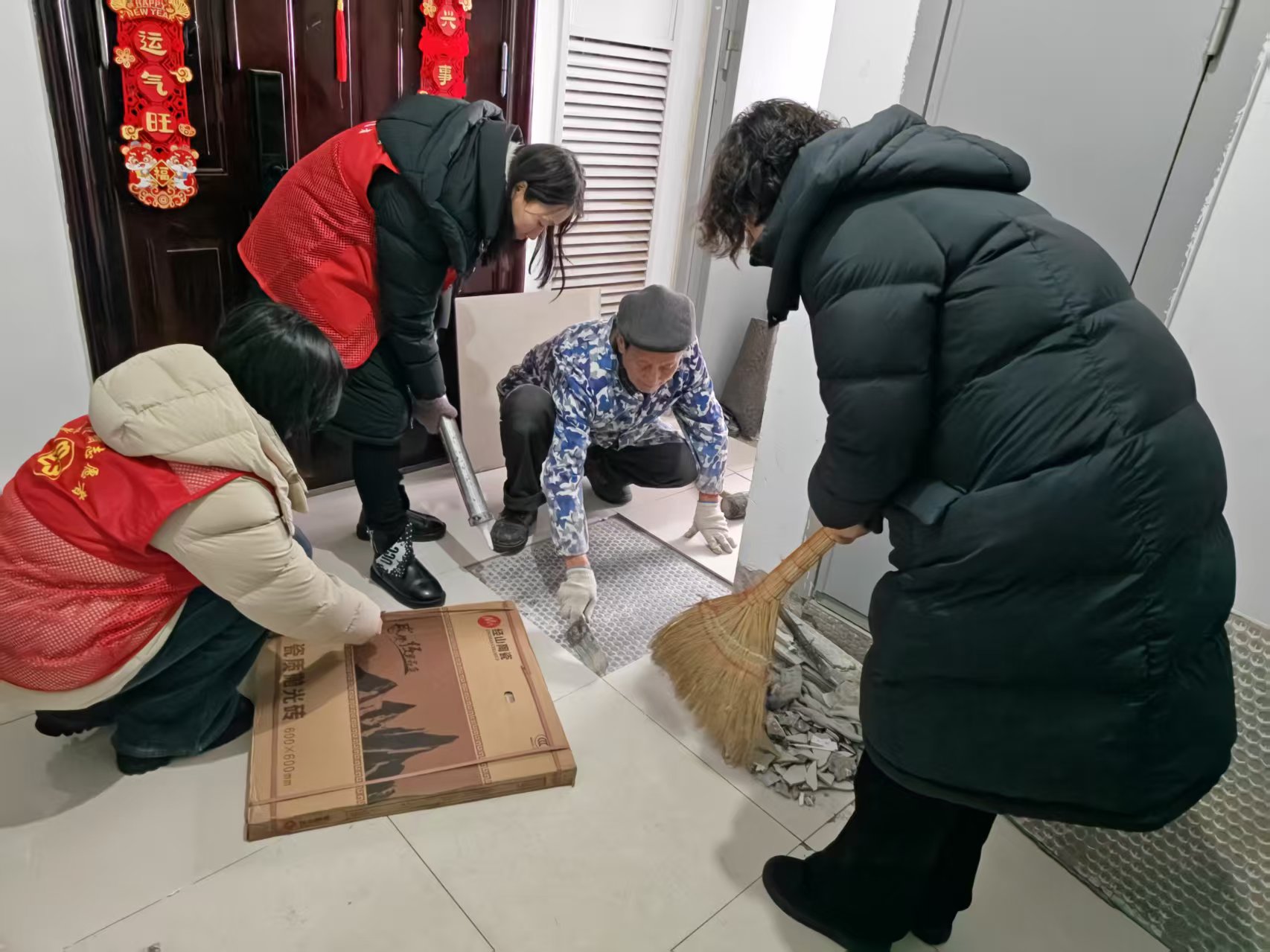 联动攻坚,高效推进保进度。为确保春节前完成楼道地砖隐患整改,社区与物业组建联合修复队伍,分工协作推进修复工作。党员骨干冲锋在前,不畏严寒拆除楼道内松动、鼓起的地砖;物业维修人员凭专业技术,按规范清理基层、平整地面,严控施工质量;社区工作人员统筹协调,及时对接居民需求、告知施工时段,避免影响日常出行。连日来,修复队伍穿梭于15栋楼栋楼道,坚守修复一线、完成多个楼栋修复。修复后的地面平整牢固,既消除安全隐患,又美化楼道环境,切实保障居民出行安全与居住舒适度。