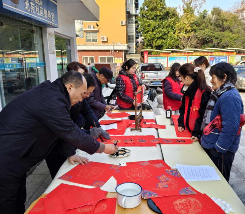 春联送福暖寒冬,赓续初心谱新篇。“板凳会”结束后,活动迎来暖心环节——党员志愿者现场书写春联、福字,为居民送上新春祝福。书写台前,老党员们挥毫泼墨、笔走龙蛇,志愿者们一旁协助铺纸、递墨,“福暖家园添祥瑞,党恩浩荡润民心”“国泰民安迎马年,邻里和睦共安康”等一幅幅寓意美好、笔力遒劲的春联,一个个喜庆吉祥的福字接连诞生,墨香四溢间满是新春气息与邻里温情。志愿者们则将写好的春联、福字免费送到现场居民手中,传递新春问候与社区关怀,让冬日的广场暖意融融。