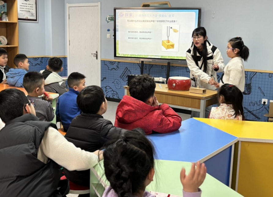 在手工实践环节,传声筒制作课让孩子们动手又动脑。大家利用纸杯、棉线等简单材料,亲手制作专属传声筒,通过绷紧棉线传递声音,亲身感受声音振动与固体传声的科学原理。孩子们互相配合、分享交流,在动手实践中收获知识与快乐。