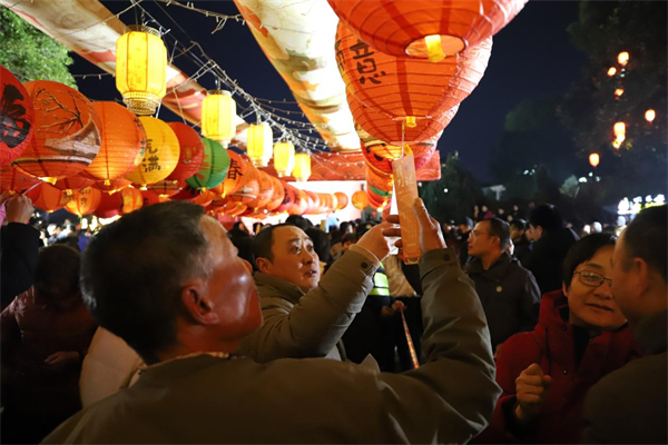 夜幕下,广场上的元宵主题布景熠熠生辉,大红灯笼高高挂起,暖融融的灯光将夜色装点得格外温馨。大批居民看到活动宣传视频后慕名而来,在社区志愿者的有序引导下欢喜入场。古艺传薪・非遗雅赏、灯韵漆香・手作寻趣、谜趣盈春・智解新章、暖食圆韵・情满新岁、投壶寄趣・雅玩迎春、骏文载韵・墨叙新程六大活动区域满场欢腾,群众穿梭其间、流连忘返,沉浸式感受传统佳节的独特魅力。现场人头攒动、喜气洋洋,在欢声笑语中勾勒出甘棠镇丙午马年新春的鲜活气象,让传统元宵佳节的人间烟火气在广场上浓浓绽放。