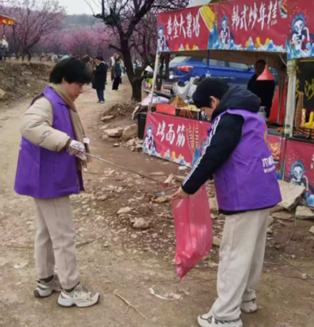 “这里的梅花太美了,可不能让垃圾破坏了这份诗意。”活动现场,身着紫色马甲的巾帼志愿者们手持垃圾夹、垃圾袋,沿着景区步道、花丛深处、摊位周边细致清理塑料袋、果皮纸屑等废弃物。大家分工协作、默契配合,有的弯腰捡拾草丛中的杂物,有的耐心劝导游客规范投放垃圾,还有的主动帮助商户整理摊位周边环境。“以前来赏梅,偶尔能看到路边的垃圾,今天看到志愿者们这么用心,我们也更自觉了。”一位带着孩子赏花的市民感慨道。志愿者们用“弯腰一秒”的行动,不仅让景区环境更加整洁有序,更带动了游客主动参与到生态保护中来,让“爱护环境、文明出游”的理念深入人心。