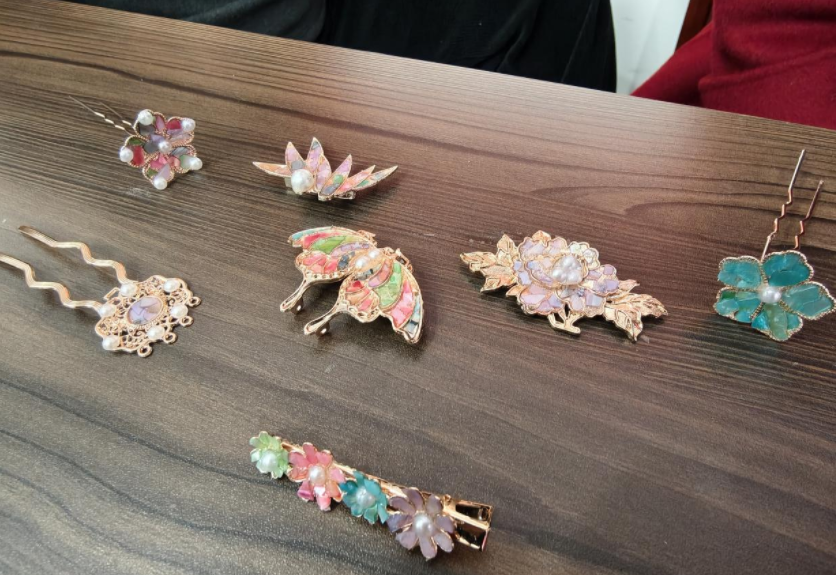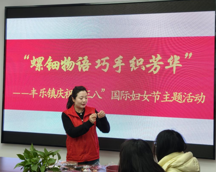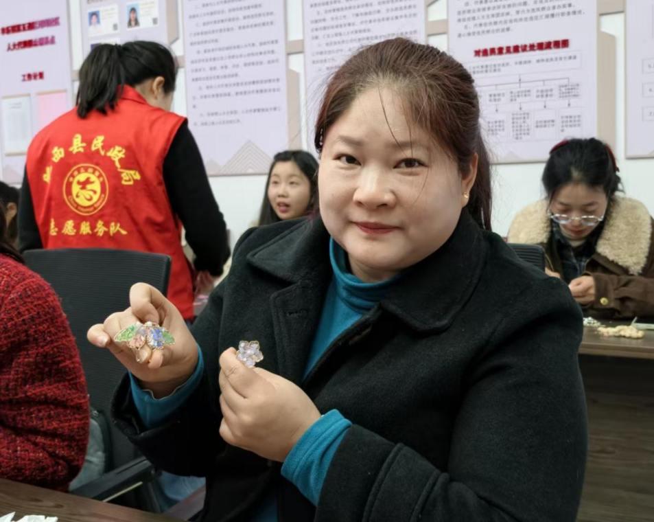 活动在指尖艺术中拉开帷幕。该镇妇联特别邀请合肥市民欣社工的志愿者,为在场的村居妇联主席带来一场别开生面的非遗螺钿手工体验。志愿者首先详细介绍了螺钿这一流传千年的传统工艺的历史渊源与制作技巧。在志愿者的指导下,平日里忙碌于基层一线的妇女干部们瞬间化身“能工巧匠”,耐心碾碎螺壳片,小心翼翼地镶嵌、打磨。一片片细小的螺钿碎片在指尖流转,逐渐在发簪、胸针等器物上幻化成精美的图案。大家互相交流配色与手法,现场气氛热烈欢快。