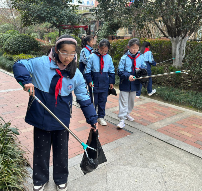 理论学习之后,同学们化身“小小志愿者”,手持夹子、垃圾袋等工具,走进社区所辖小区开展环境整治志愿服务。大家分工协作,仔细清理公共区域的烟头、纸屑、塑料袋等杂物,不放过任何一个卫生死角。短短15分钟的劳动,孩子们热情高涨、干劲十足,用稚嫩的双手为美化社区环境贡献力量。过往居民纷纷驻足点赞,称赞他们是“新时代的小雷锋”。在劳动实践中,孩子们亲身体验了奉献的快乐,对雷锋精神有了更深的理解。