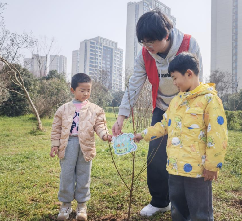 活动中,社区的志愿者与小朋友们分工协作,志愿者们负责挖坑、填土,孩子们则小心翼翼地摆放树苗,用小桶为小树浇水,每一个步骤都认真细致、有条不紊。稚嫩的身影穿梭在绿意间,汗水与笑容相映,种下的小树迎风挺立,为小区增添了勃勃生机。种植完成后,孩子们拿着写有环保标语的挂牌挂在小树上,这些挂牌承载着孩子们的美好期许,也让爱绿护绿的意识传递给每个人。