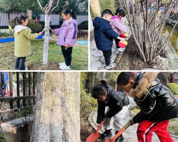 在老师的指导与帮助下,中班的小朋友们化身“小小护绿员”,热情满满地投入到护绿行动中。大家手持小刷子,认真地为校园里的小树刷上白漆,给树木穿上“防护衣”;拿起小水壶,为树苗浇灌清水,让嫩芽尽情吮吸春日甘露;握紧小铲子,细心为树木松土,让根系更好地呼吸生长。孩子们分工合作、认真专注,稚嫩的脸上洋溢着劳动的快乐。