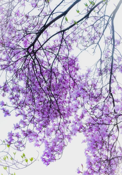 映山蓝,学名丁香杜鹃,属于国家二级保护珍稀植物,是一种野生杜鹃品种,也叫紫杜鹃。它初开呈紫色,盛花期在阳光映照下渐变为淡雅的蓝紫色,气韵悠长,是深山中的蓝紫色秘境,被当地群众形象称为映山蓝。