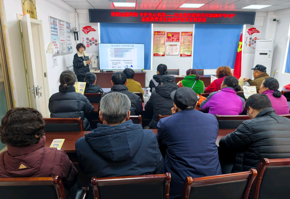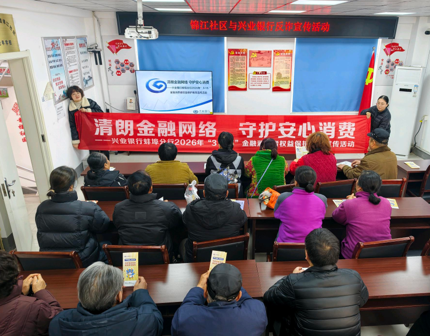 3月12日,兴业银行蚌埠分行围绕“清朗金融网络 守护安心消费”主题,走进张公山锦江社区,开展2026年“3 15”金融消费者权益保护教育宣传活动,守护金融消费者合法权益。
