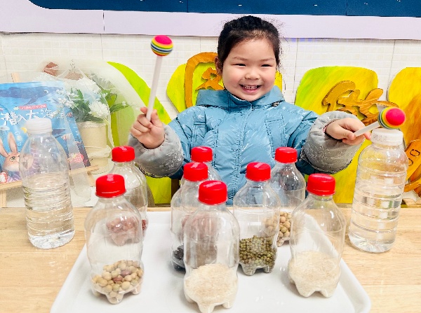 在教室里,一场“水之声”音乐会悄然上演。玻璃瓶排排站,水量各异藏玄机。孩子们用小木棒轻敲,探索着水与音乐的奇妙融合。满瓶低沉似鼓,半瓶清脆如铃,少瓶高亢若笛,每一个音符都似乎在诉说着节水的重要性,提醒着大家珍惜每一滴生命之水。