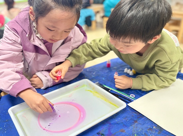 色彩与水的交融,绽放成一幅幅梦幻般的画卷。孩子们用画笔蘸取颜料,轻轻点在水滴上,看着色彩随着水波缓缓晕开,仿佛为每一滴水穿上了七彩衣裳。这不仅仅是一场艺术探索,更是对水资源保护的深情呼唤——每一幅画,都是孩子们对地球未来的美好愿景。