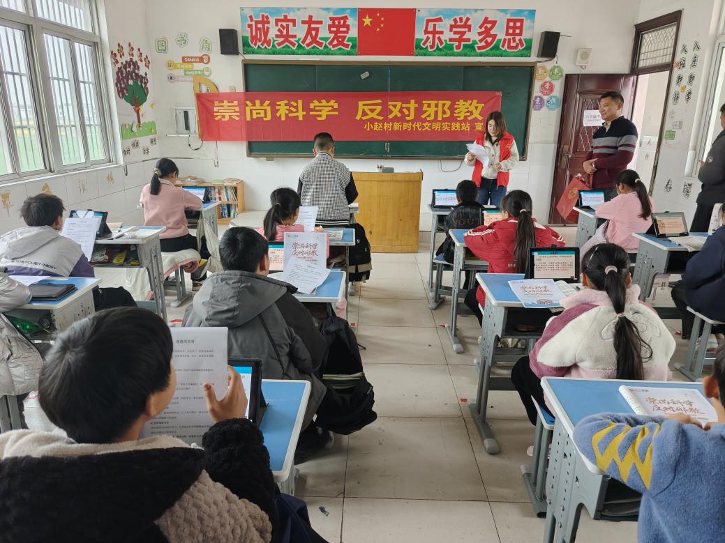 为进一步提升青少年防范邪教意识,认清邪教危害,弘扬科学精神,3月24日,阜阳颍州区三十里铺镇小赵村联合辖区小赵小学开展“崇尚科学 反对邪教”主题宣传教育活动。