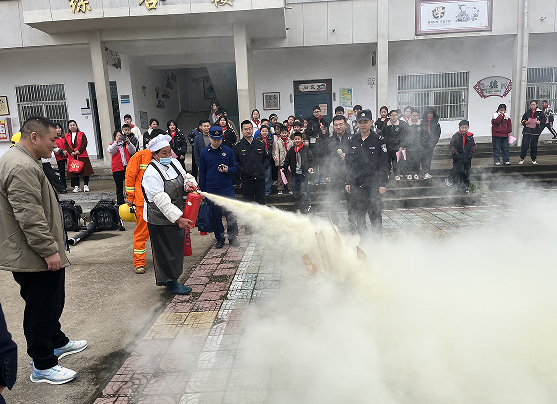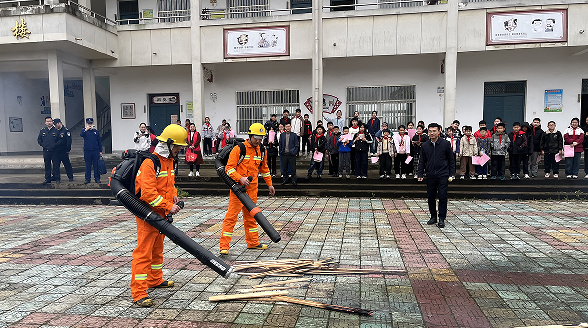 教学结束后,实战化灭火演练正式展开。演练现场模拟校园初期火灾场景,同时结合清明节常见火灾类型,乡镇应急队员操作小型消防车,完整演示了车辆启动、水枪调试、精准灭火的全过程,清晰演示了小型消防车在校园狭窄区域及野外初期火灾处置中的作业优势和操作技巧,让师生们近距离感受应急处置的专业流程和装备作用。随后,在乡镇应急队员和消防指战员的共同指导下,师生们有序分组,一方面进行灭火器实操演练,亲身参与初期火灾处置;另一方面近距离观摩小型消防车灭火演示,切实将理论知识和清明节防火要求转化为实践能力。