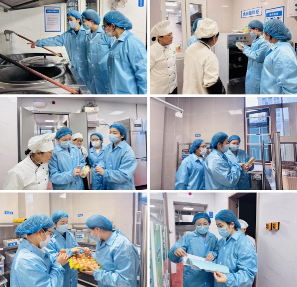 执行负责人邢凌颖、后勤工作负责人甄庆庆、食品安全员童引三位老师,共同深入食堂操作间、食材储存区、洗消间等区域开展全面排查。她们检查烹饪设备运行与清洁情况,核对食材及物资保质期、冷藏冷冻温度,严把生熟分开存放要求,同时排查消防、用电安全,核对进货台账、消毒及留样记录,确保各环节规范有据。