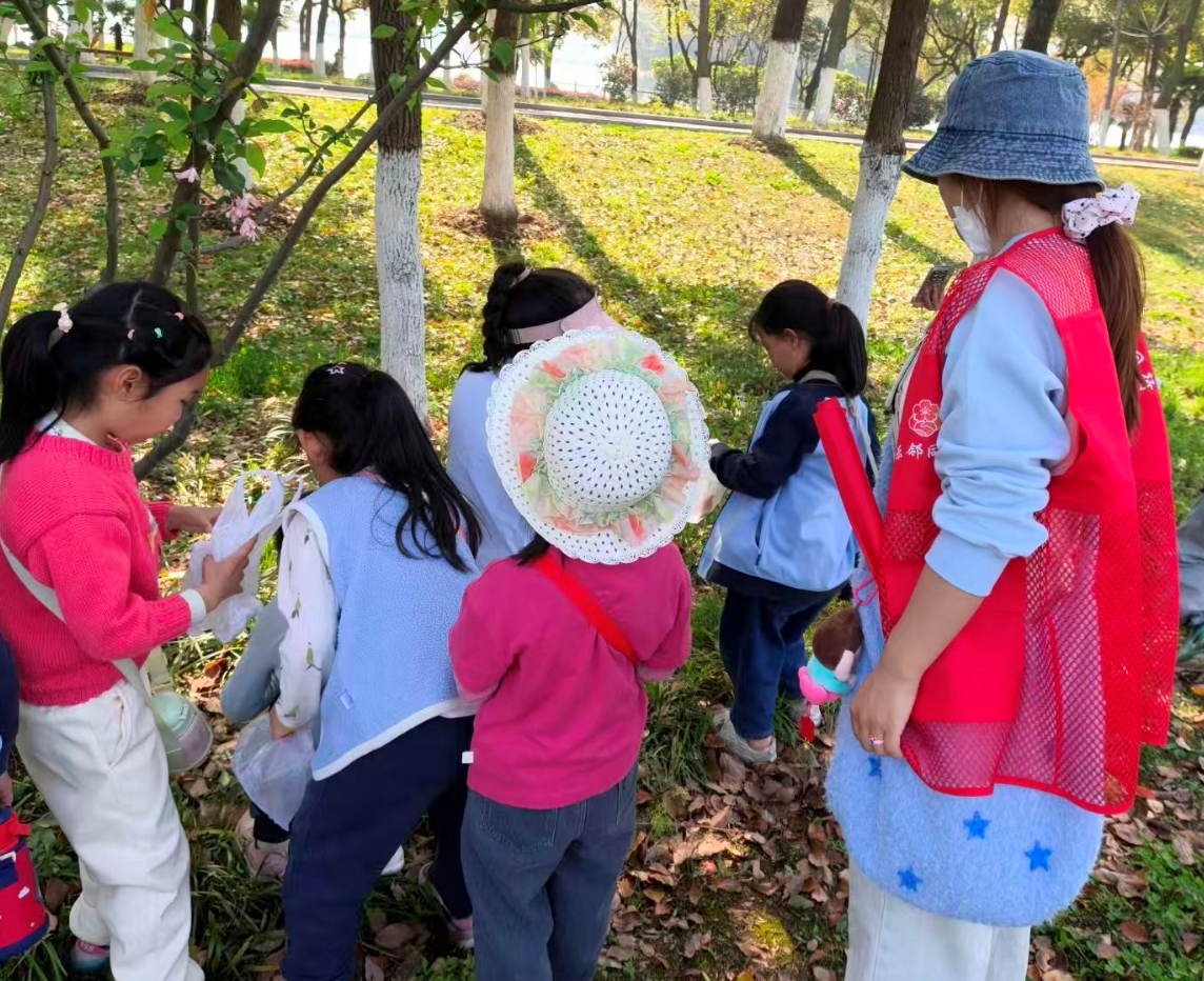 (图为社区志愿者和幼儿园小朋友一起拾捡花朵)