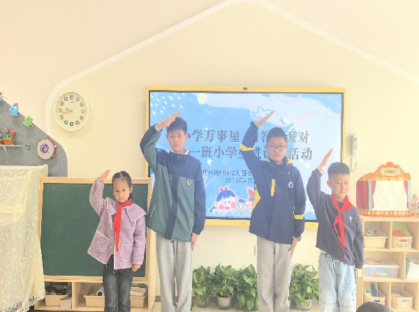 活动伊始,身着整洁校服、佩戴鲜艳红领巾的“小老师”闪亮登场。在老师的引导下,他们分别从校园环境、特色活动、课堂常规和少先队标志四个方面,向大班幼儿展示了真实的小学生活。