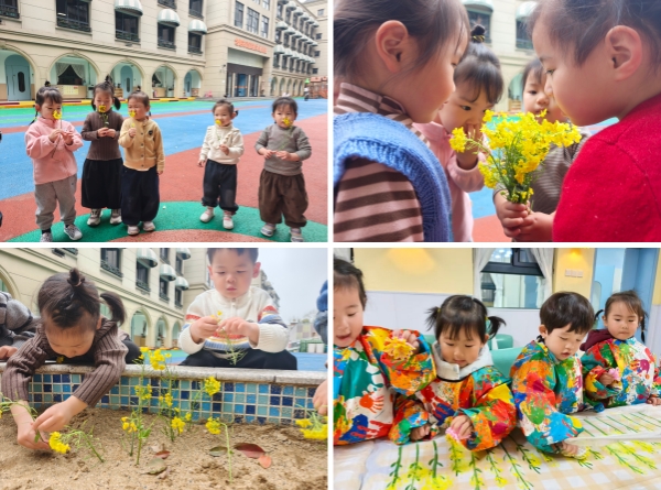 带着孩子们的好奇我们回到班级展开了你一言我一语的对话。一缕金黄映眼帘,油菜花田绽芬芳。老师携花入园,宝贝们凑近轻嗅,与春日美好撞个满怀。