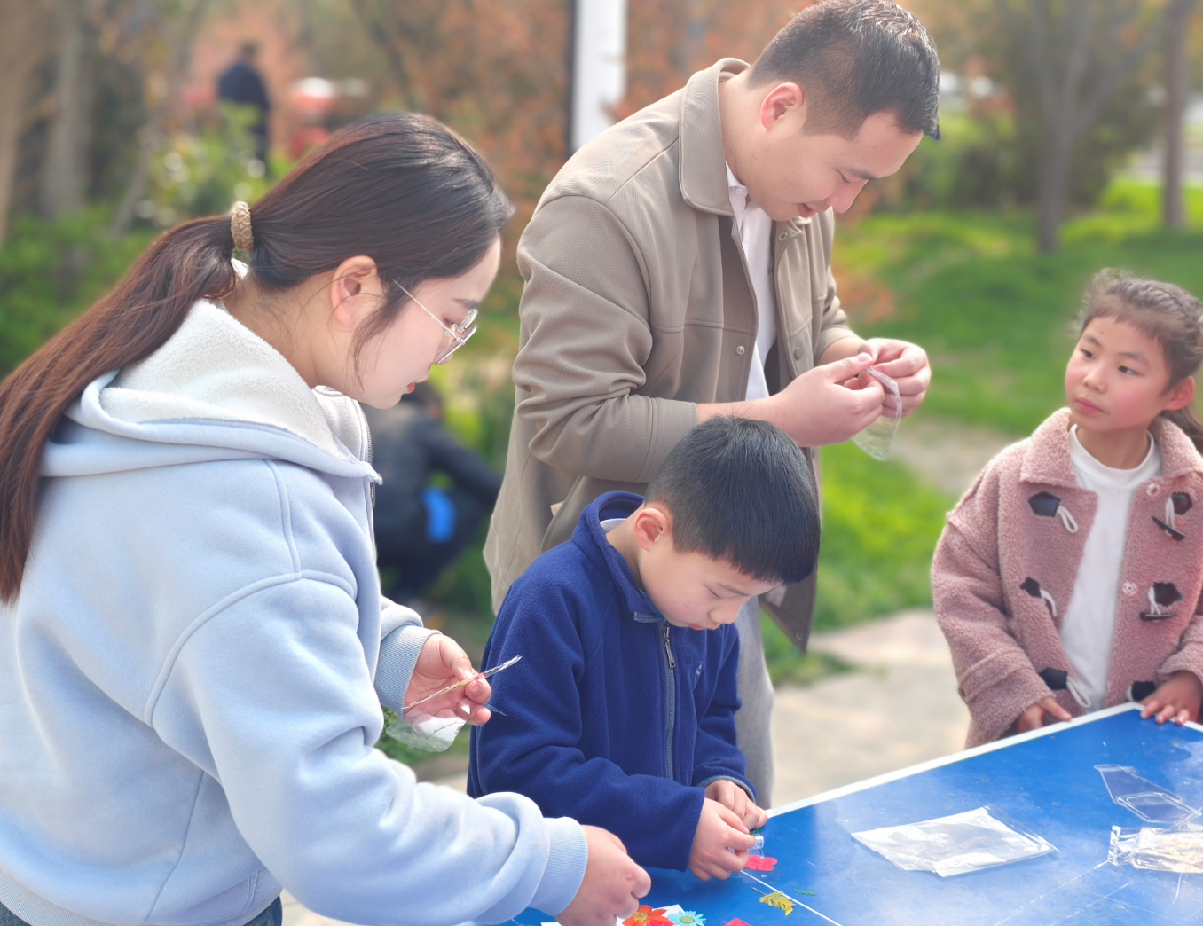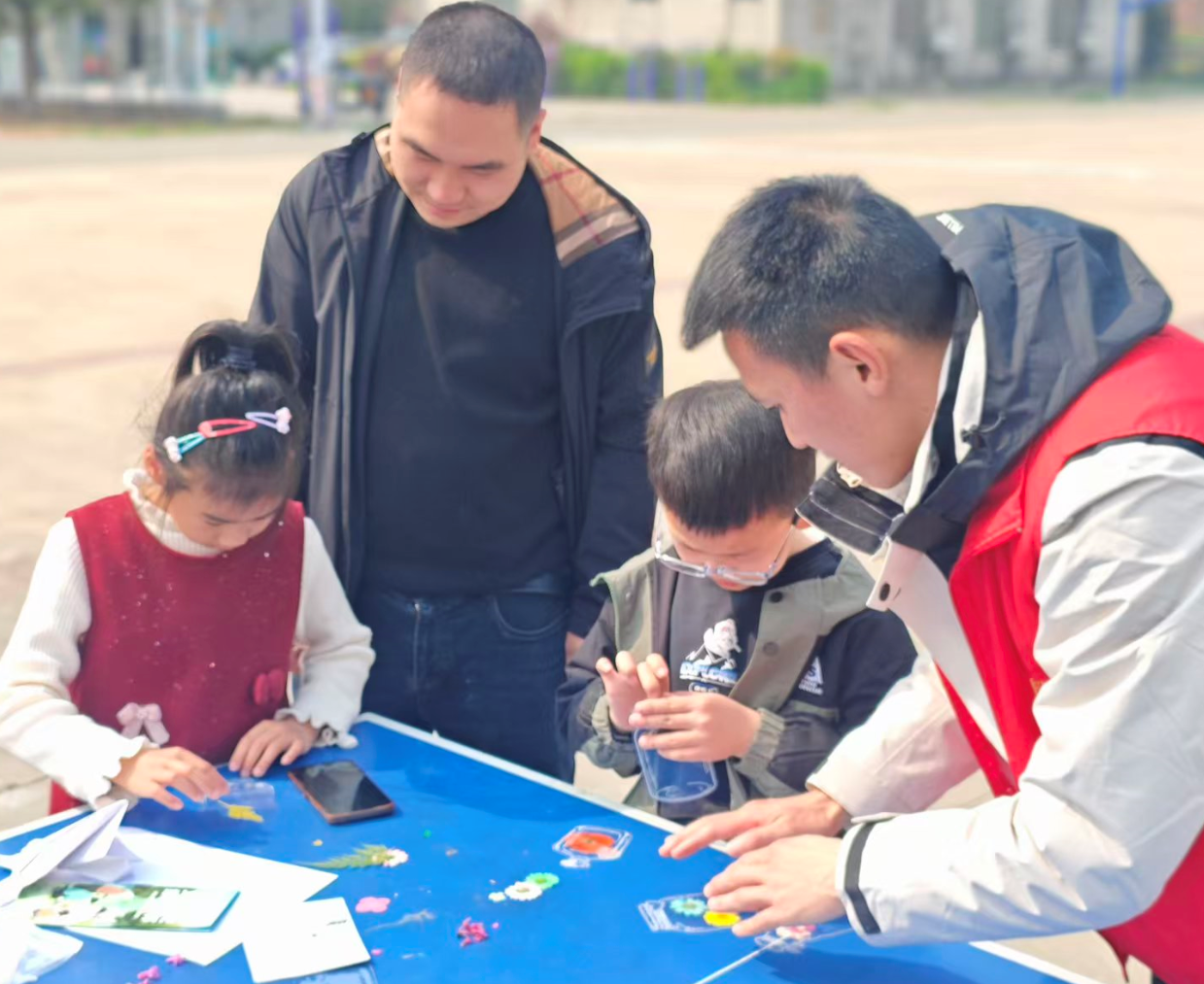 在手工创作环节,孩子们化身“小小自然艺术家”,开启创意之旅。他们或蹲在草坪上,细心挑选形态各异的树叶、色彩缤纷的花瓣;或围坐在桌前,在社工与家长的耐心指导下,精心设计、巧妙拼贴,将花草定格在透明书签上。孩子们充分发挥创意,有的用小雏菊搭配绿叶打造清新风格,有的用多彩花瓣拼出可爱造型,每一枚书签都承载着独特的春日巧思。现场欢声笑语不断,孩子们在动手实践中感受创作的乐趣,在亲子协作中增进情感联结,让春日的生机与美好在指尖绽放。