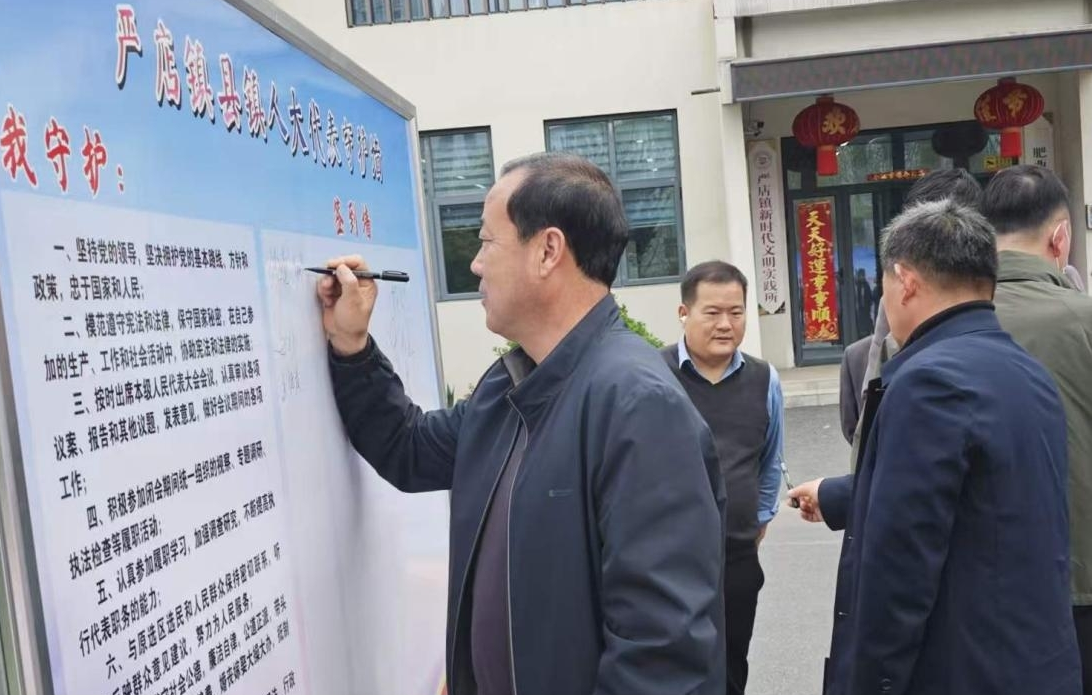 宣传活动结束后,“代表法”承诺签名活动如期开展。全体县镇人大代表依次在签名横幅上郑重签名,以签名践承诺、以承诺促履职,庄严表态将严格遵守《代表法》规定,牢记代表使命,密切联系群众,倾听群众呼声,聚焦群众急难愁盼问题,用心用情用力为群众办实事、解难题,充分发挥代表主体作用,为严店镇高质量发展、为肥西现代化建设贡献代表力量。