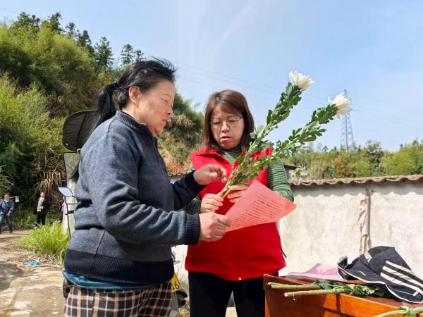 清明期间,社区志愿者在辖区各集中葬坟点设置文明祭祀宣传点,通过发放文明祭祀倡议书、鲜花换纸钱、现场宣讲等方式,向过往群众普及文明祭祀相关知识,积极引导鲜花祭祀、植树缅怀、家庭追思等绿色环保的祭祀方式,寄托对先人的追思与缅怀,让祭祀回归缅怀先辈、传承家风的本质。