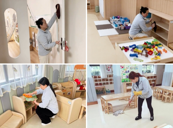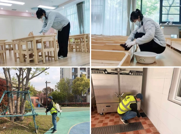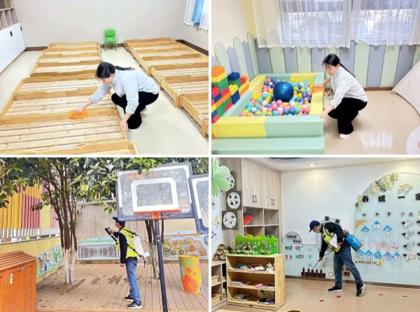 在专业消杀的基础上,全体保育员开展精细化卫生清洁。大家分工协作,对教室地面、门窗、床具、玩具等进行全面擦拭整理,不留卫生死角。同时对园区公共区域、绿化带、下水道、垃圾桶周边开展除虫防虫,并对食堂操作间、储物间等重点区域深度清洁消杀,严守食品安全与环境卫生关口,守护幼儿健康成长。