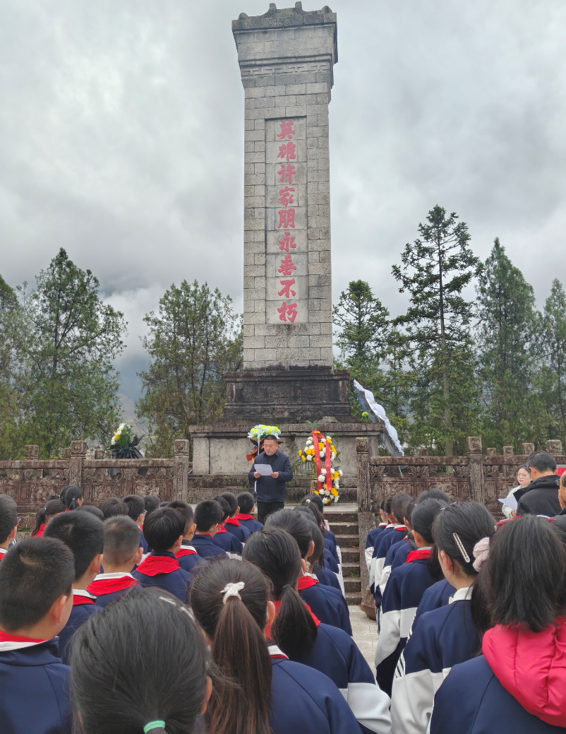 活动现场,党员教师率先垂范,与学生一同在烈士纪念碑前整齐列队、敬献花篮、肃立默哀,向革命先烈致以崇高敬意。在英烈事迹宣讲环节,党员教师代表详细讲述了“黄继光式” 英雄许家朋 1953 年朝鲜战场舍身堵枪眼的英勇事迹,党支部书记周声高现场勉励学生以先烈为榜样,立大志、勤学习、勇担当。党员教师还带领优秀学生代表自发擦拭烈士墓碑,以实际行动缅怀英烈,让师生在沉浸式实践中感悟共产党人敢于斗争、不怕牺牲的精神风范。