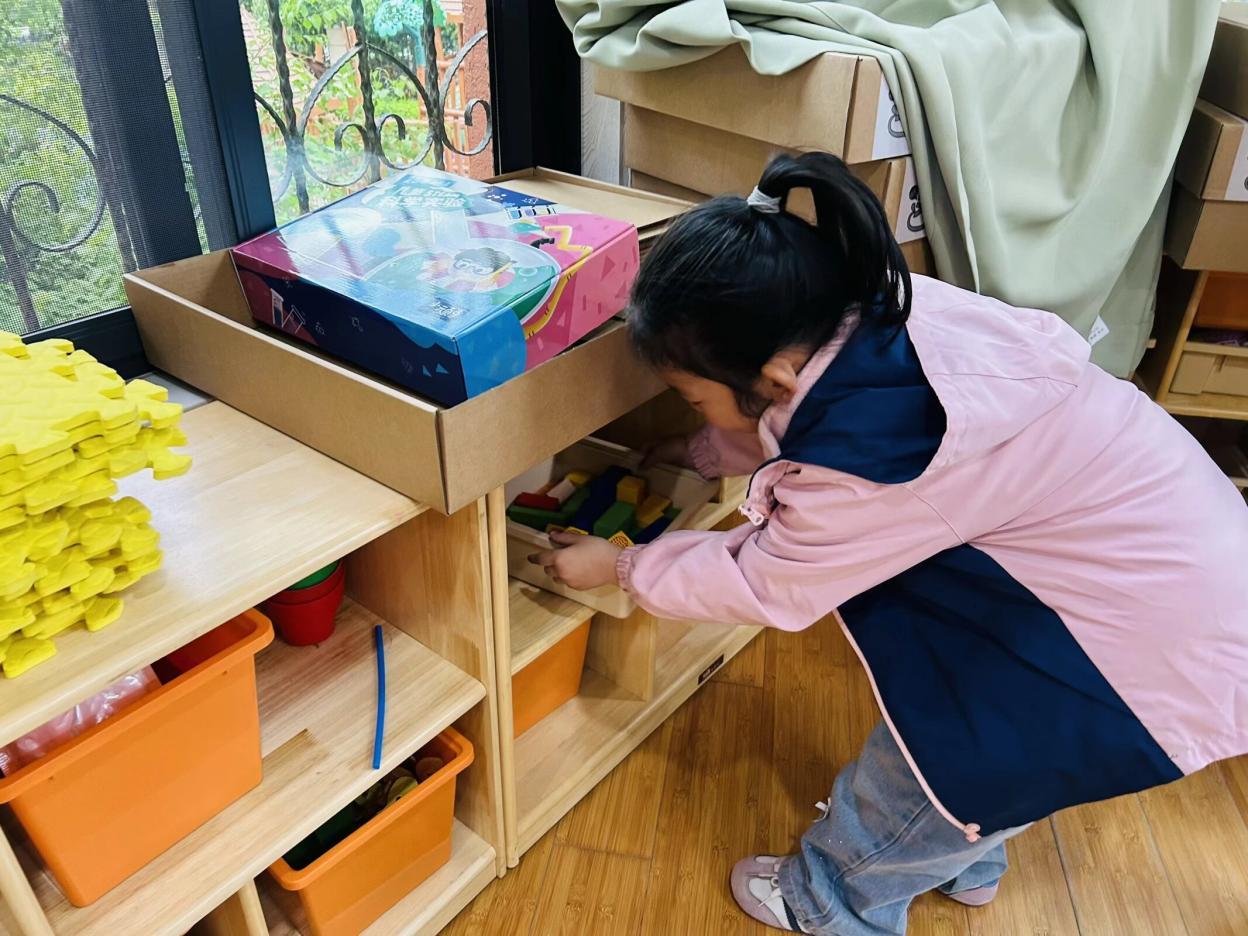 在中三班的教室里,区域活动结束后,“整理时间到”的温馨音乐准时响起。孩子们便会自觉行动起来,将散落的玩具、图书一一归位,把区域收拾得整整齐齐,完成后还会贴上奖励贴纸,给自己满满的成就感。从最开始需要老师提醒,到后来主动、有序地完成整理,在日复一日的坚持中,孩子们将外在的行为要求,慢慢内化为自觉的生活习惯。在亲手整理的过程中,孩子们的责任意识与秩序感悄然生长,也学会了为自己的游戏行为负责。