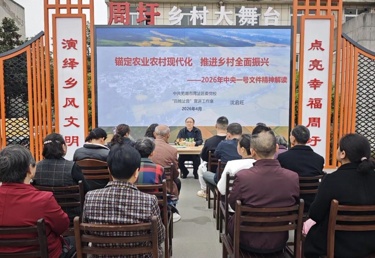直播首场,芜湖市湾沚区委党校副校长、正高级讲师沈启旺应邀作专题宣讲,深入解读了2026年中央一号文件精神,主题为“锚定农业农村现代化 推进乡村全面振兴”。宣讲紧密结合“十五五”规划纲要的战略部署,用贴近生活的语言,将国家宏观政策转化为村民听得懂的行动指南。