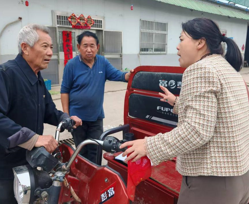 “骑电动车一定要戴好头盔,三轮车可不能违法载人……”连日来,镇村干部以入户走访为契机,挨家挨户开展“敲门行动”,面对面进行道路交通安全宣传。工作人员用方言土语拉家常、以案说法,重点面向老年人和电动车驾驶人,详细讲解无证驾驶、不戴头盔、农用车载人、酒后驾车等交通违法行为的严重危害。并在村口、集市等人流密集处发放宣传单、张贴警示标语,同时为农用车辆粘贴反光标识,让交通安全知识“听得懂、记得住、用得上”,切实从源头预防道路交通事故发生。
