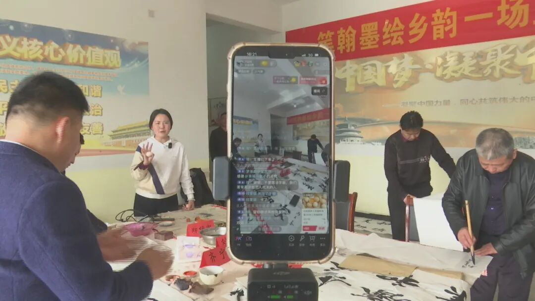 “我们村里建了直播间之后,一直想做出点特色。这次把书法和直播结合起来,既卖了货,又推广了咱们的乡土文化,效果特别好!”宿州埇桥区大店镇张庙村“和美乡村直播间”里,村委委员、当天的主播马梦弟兴奋地说道。4月23日,一场“翰墨助农直播行 和美乡村入画屏”主题活动在这里火热开展。来自区文联的多位书画家现场挥毫泼墨,将传统书画艺术与电商直播深度融合,通过“直播+书画+农产品”的创新形式,助力土特产销售和乡村文化传播,为乡村振兴注入新活力。