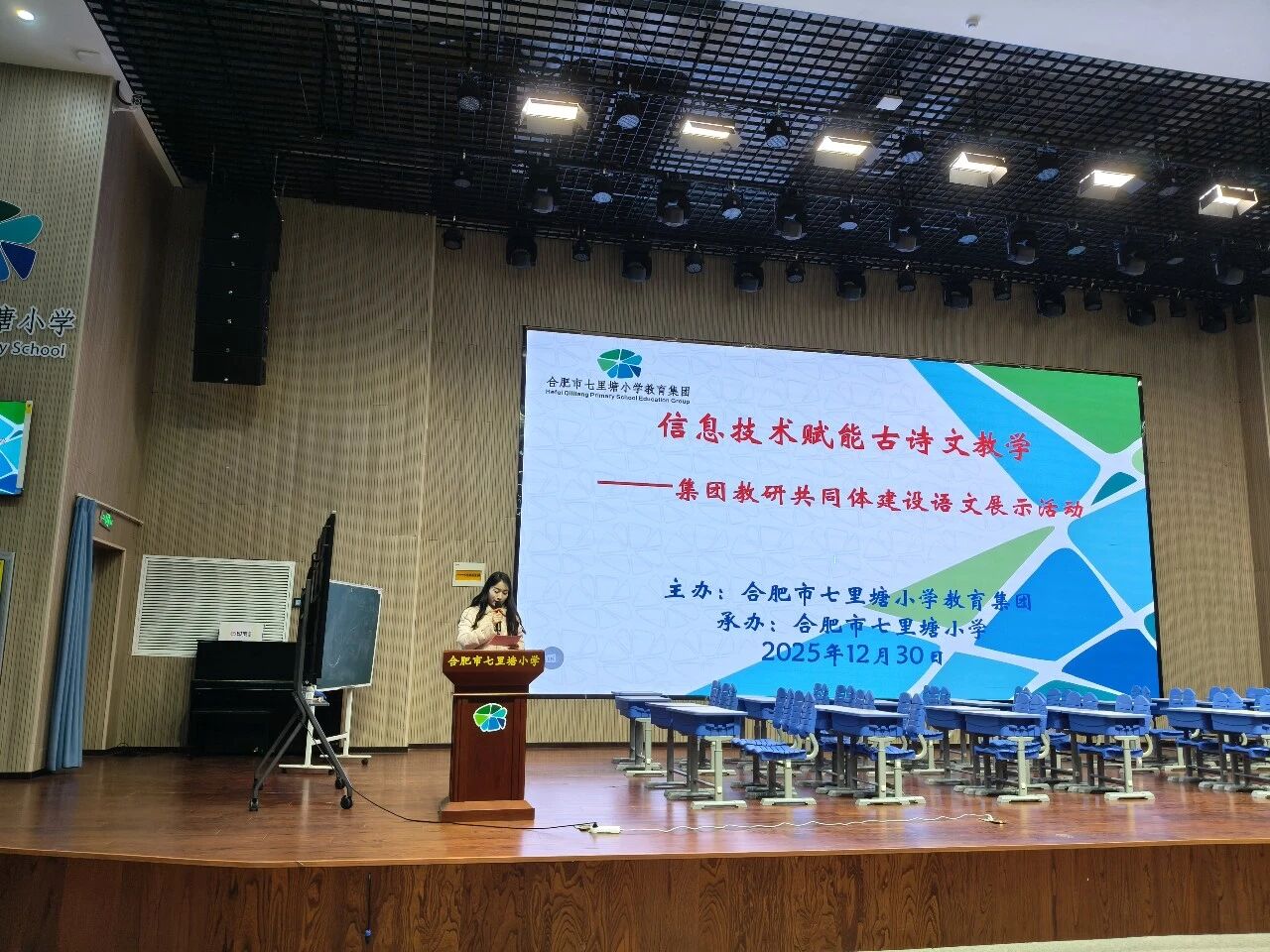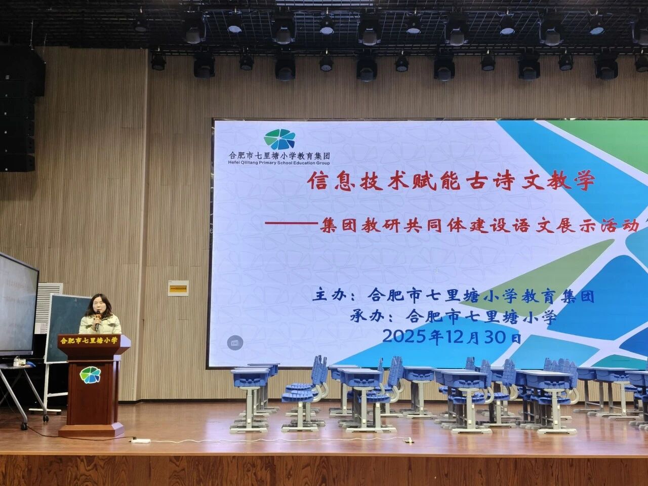 为深入探索信息技术与古诗文教学的融合路径,提升语文教师的专业素养与教学能力,2025年12月30日下午,合肥市七里塘小学教育集团在七里塘小学本部成功举办了“七里方塘,研路花香”教研共同体建设语文展示活动。本次活动以“信息技术赋能古诗文教学”为主题,吸引了集团校内外小语同仁的热情参与。