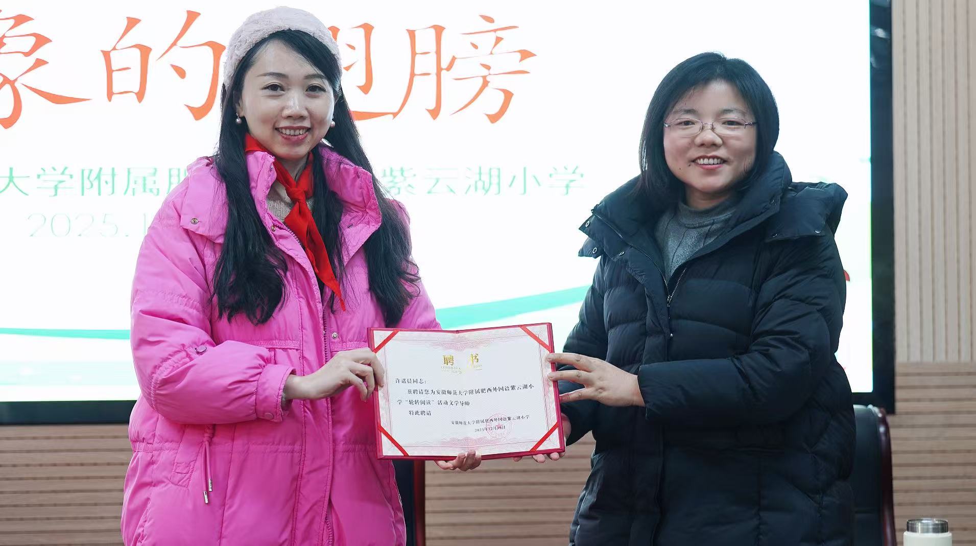 随后,学校党支部书记陈昱为许诺晨颁发聘书,正式聘请其为该校 “轮转阅读” 活动文学导师。这一举措标志着紫云湖小学 “轮转阅读” 活动将获得更专业的文学引领,为校园阅读从 “图书流转” 向 “深度体验” 升级注入强大动力,助力校园书香文化建设再上新台阶。