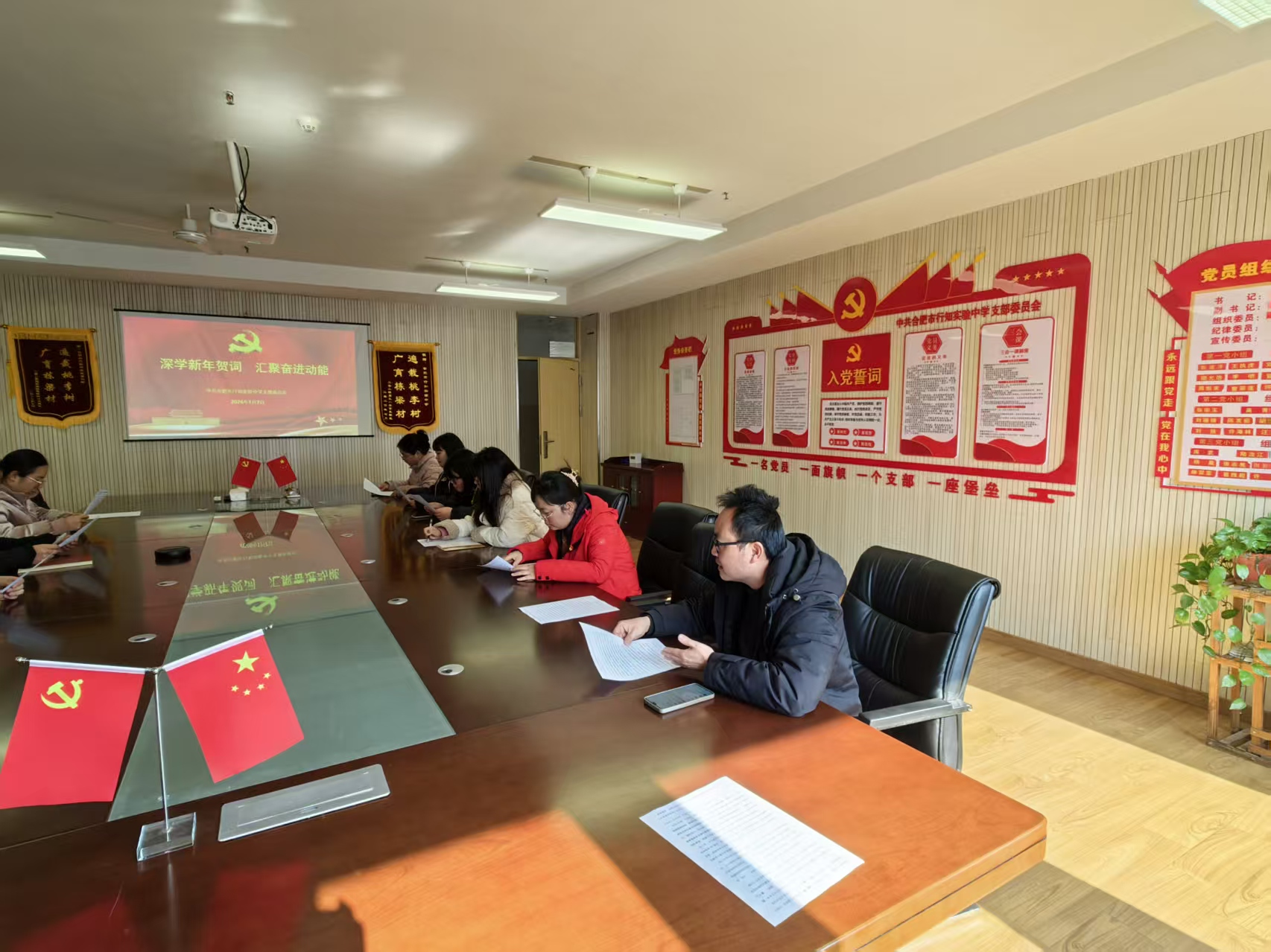 岁启新章,奋进当时。2026年1月7日,合肥市行知实验中学党支部组织全体党员教师开展“深学新年贺词,汇聚奋进动能”主题党日活动,带领党员教师研读贺词原文,汲取精神力量,凝聚立德树人的育人共识。