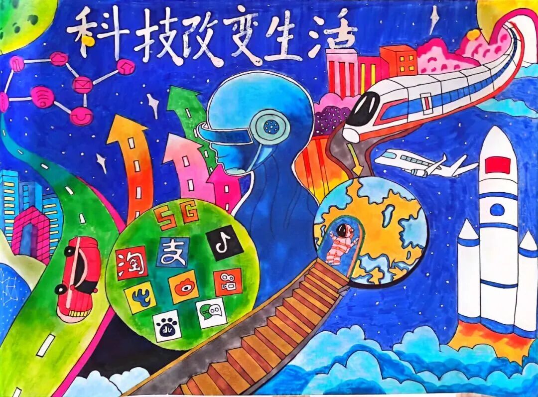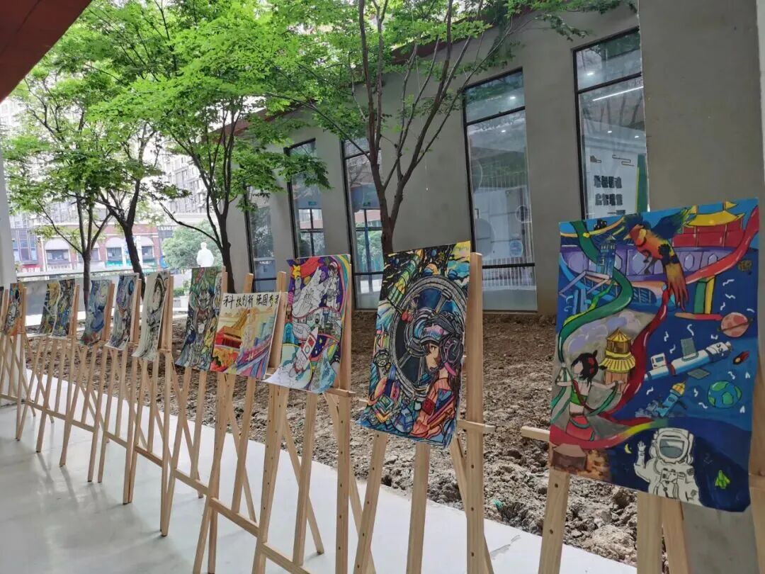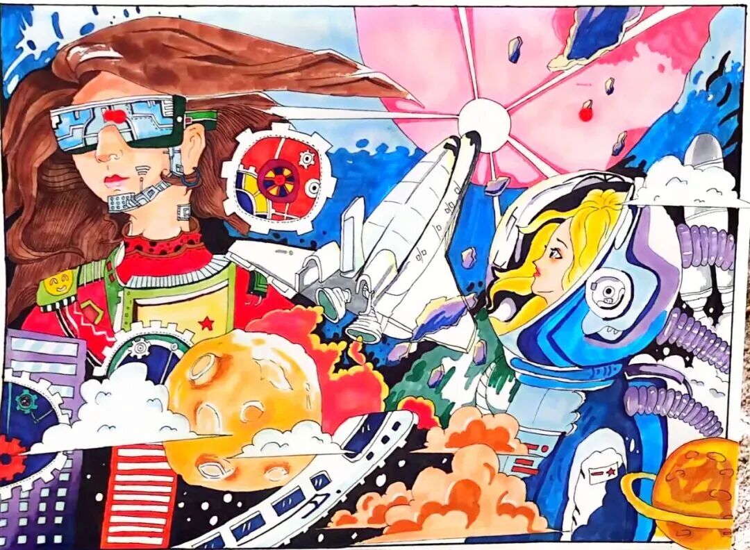 科幻画创作中,同学们将科晚中的硬核科技与未来畅想结合,星际探测、智能校园、仿生科技等图景跃然纸上,字里行间满是对国家科技发展的憧憬。