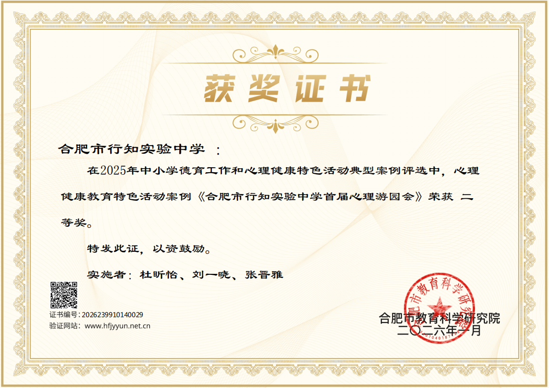 其中,教师杜昕怡、刘一晓、张晋雅报送的《合肥市行知实验中学首届心理游园会》案例荣获合肥市心理健康教育特色活动典型案例二等奖。