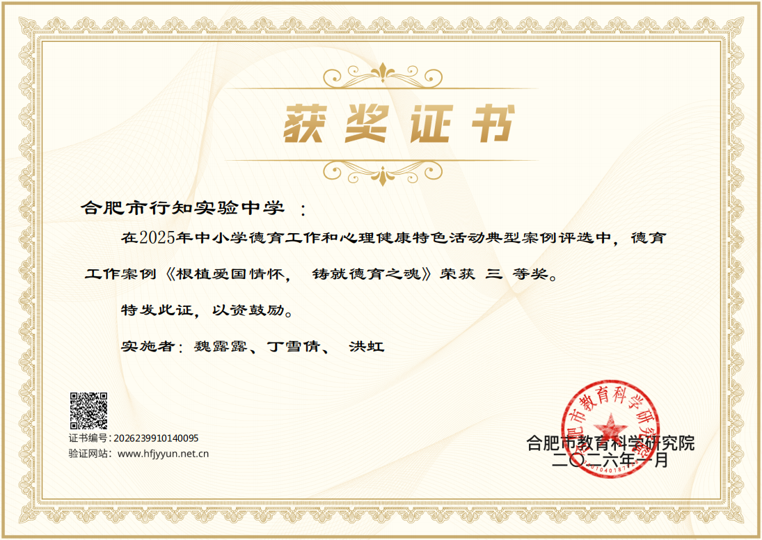 教师魏露露、丁雪倩、洪虹报送的《根植爱国情怀,铸就德育之魂》案例荣获合肥市中小学德育工作活动典型案例三等奖。