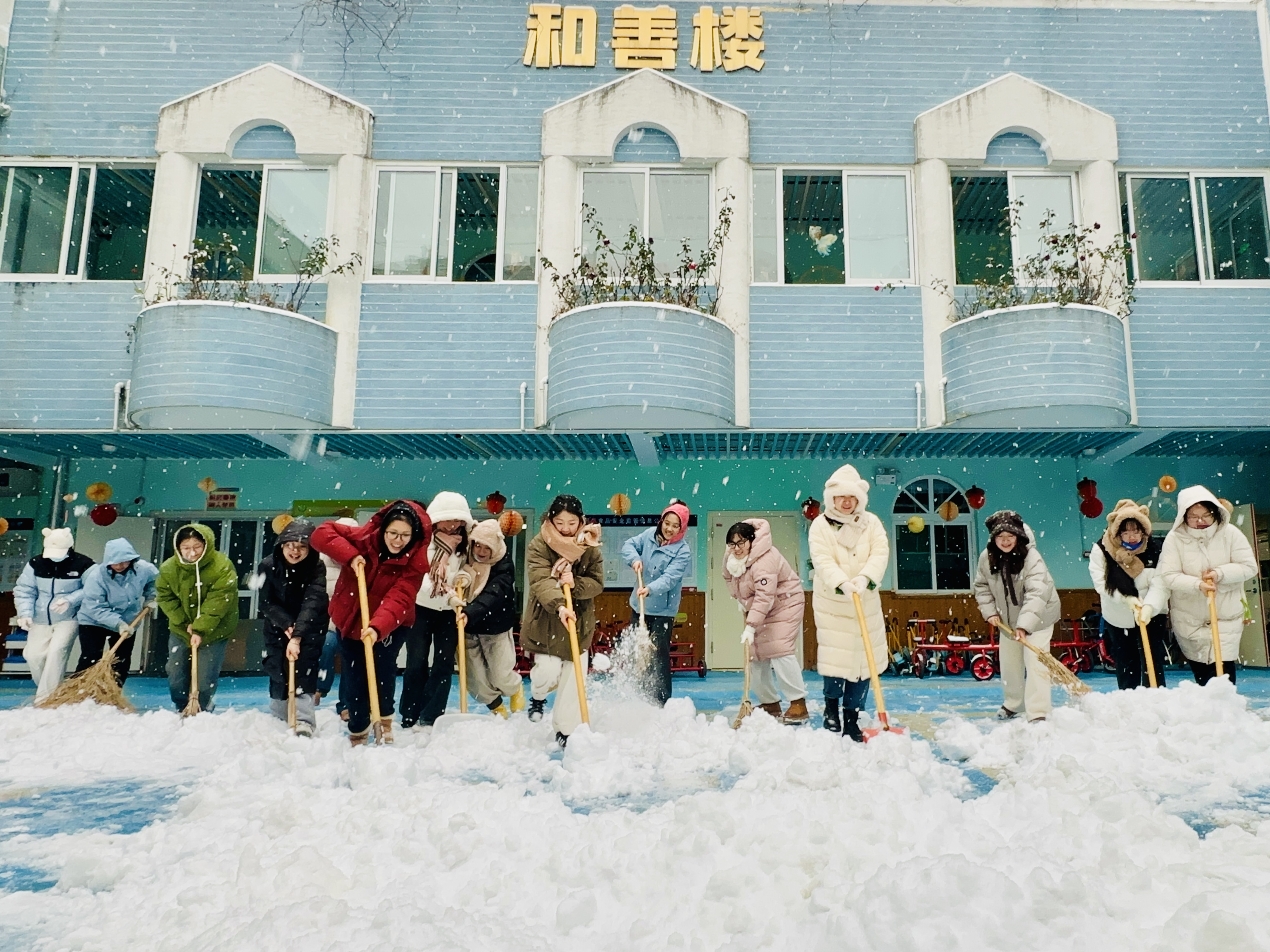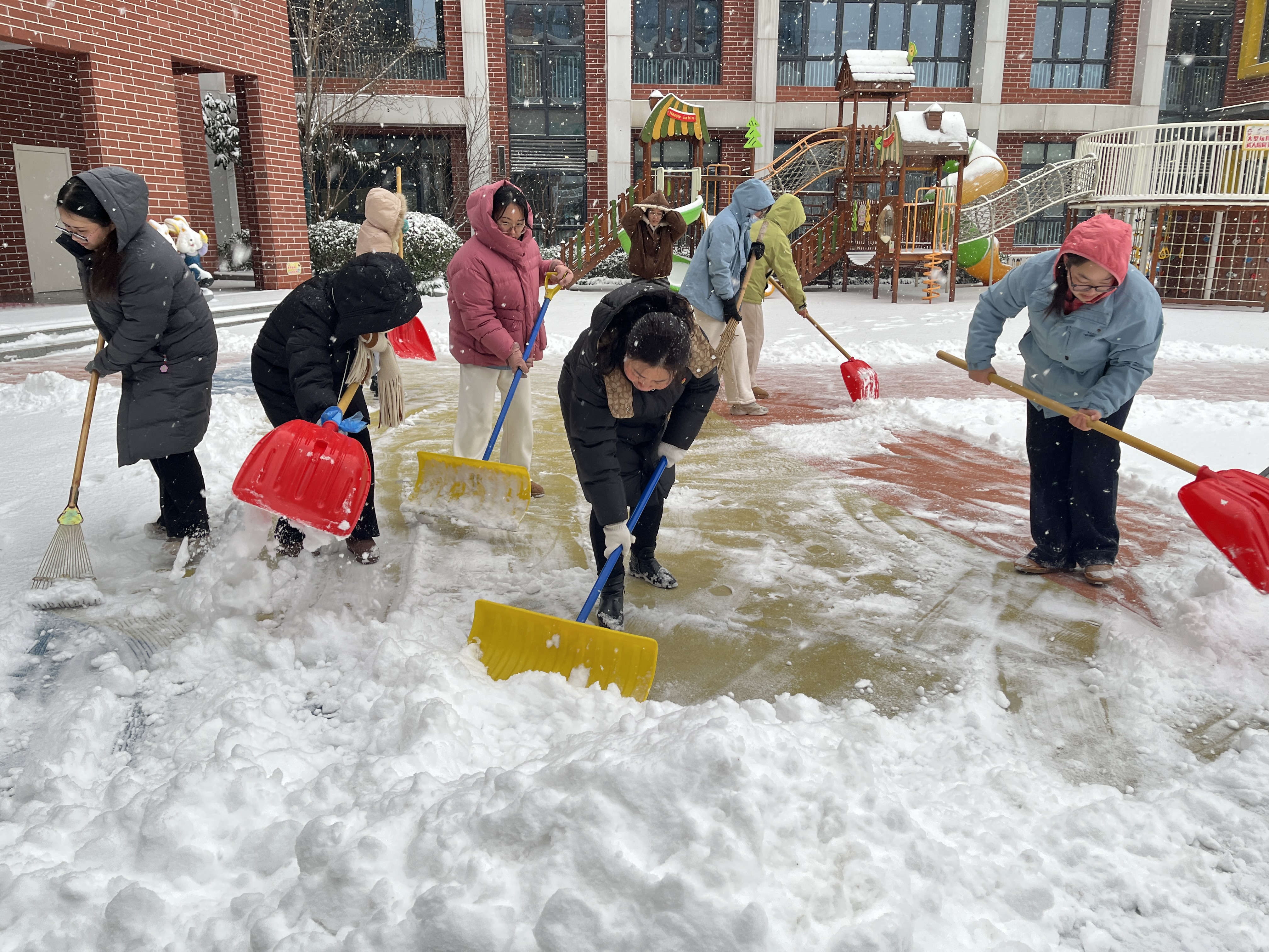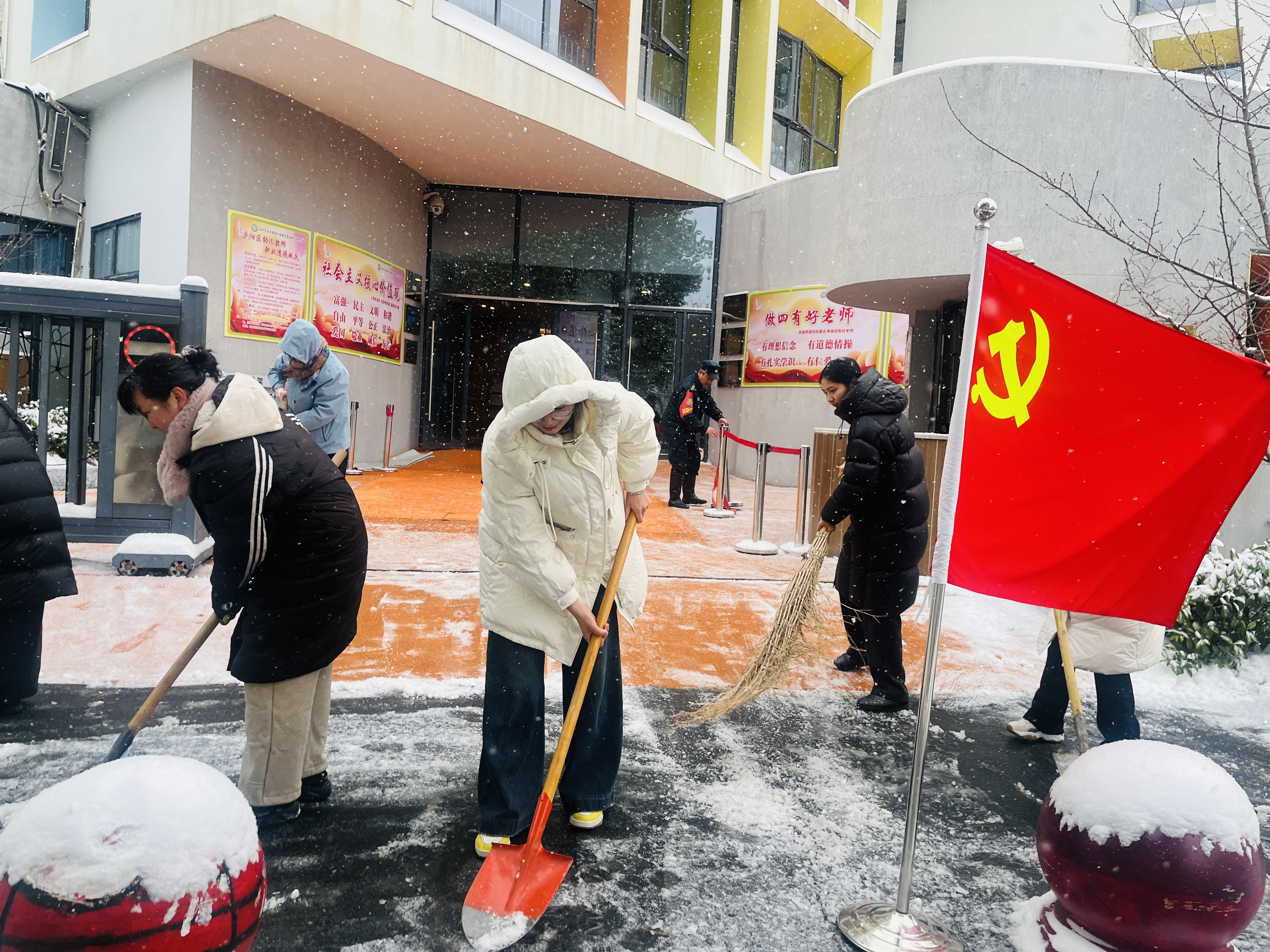 经过全体党团员的齐心奋战,集团各园区主要通道、活动场地、接送区域的积雪和冻冰被彻底清除,并铺设了防滑垫。当幼儿园第一位幼儿牵着家长的手,稳稳地踏进干净整洁的园区时,迎接她们的是老师们无比温暖的笑容。家长们纷纷点赞:“这么厚的雪,没想到幼儿园门口的路这么干净,老师辛苦了!”