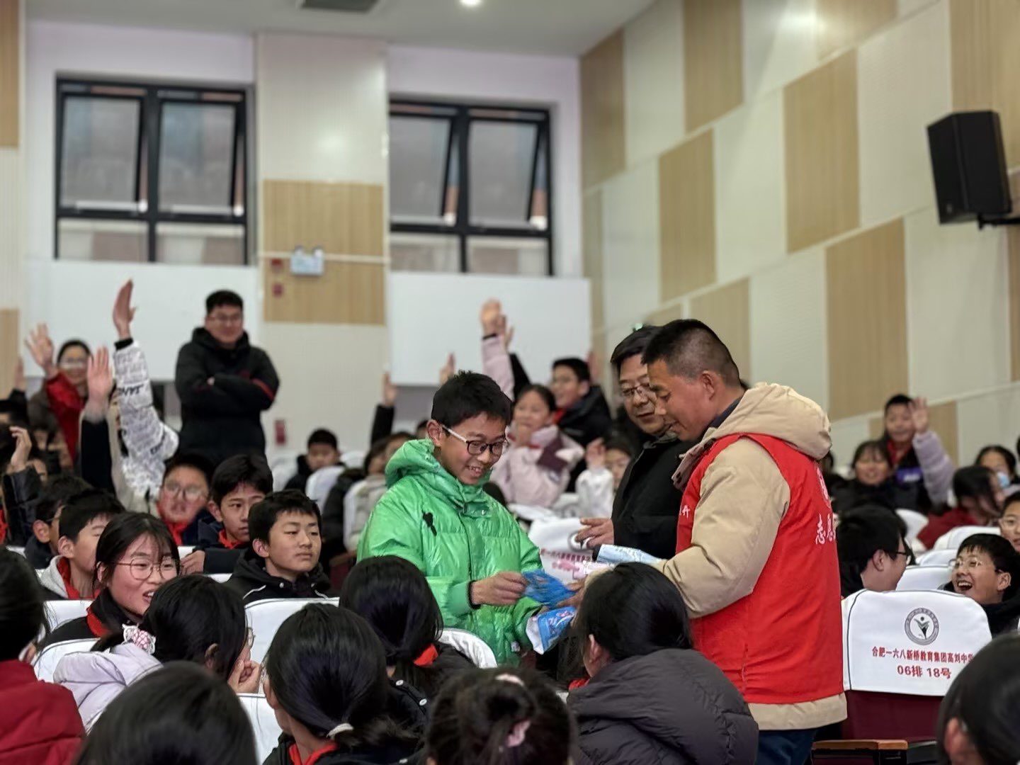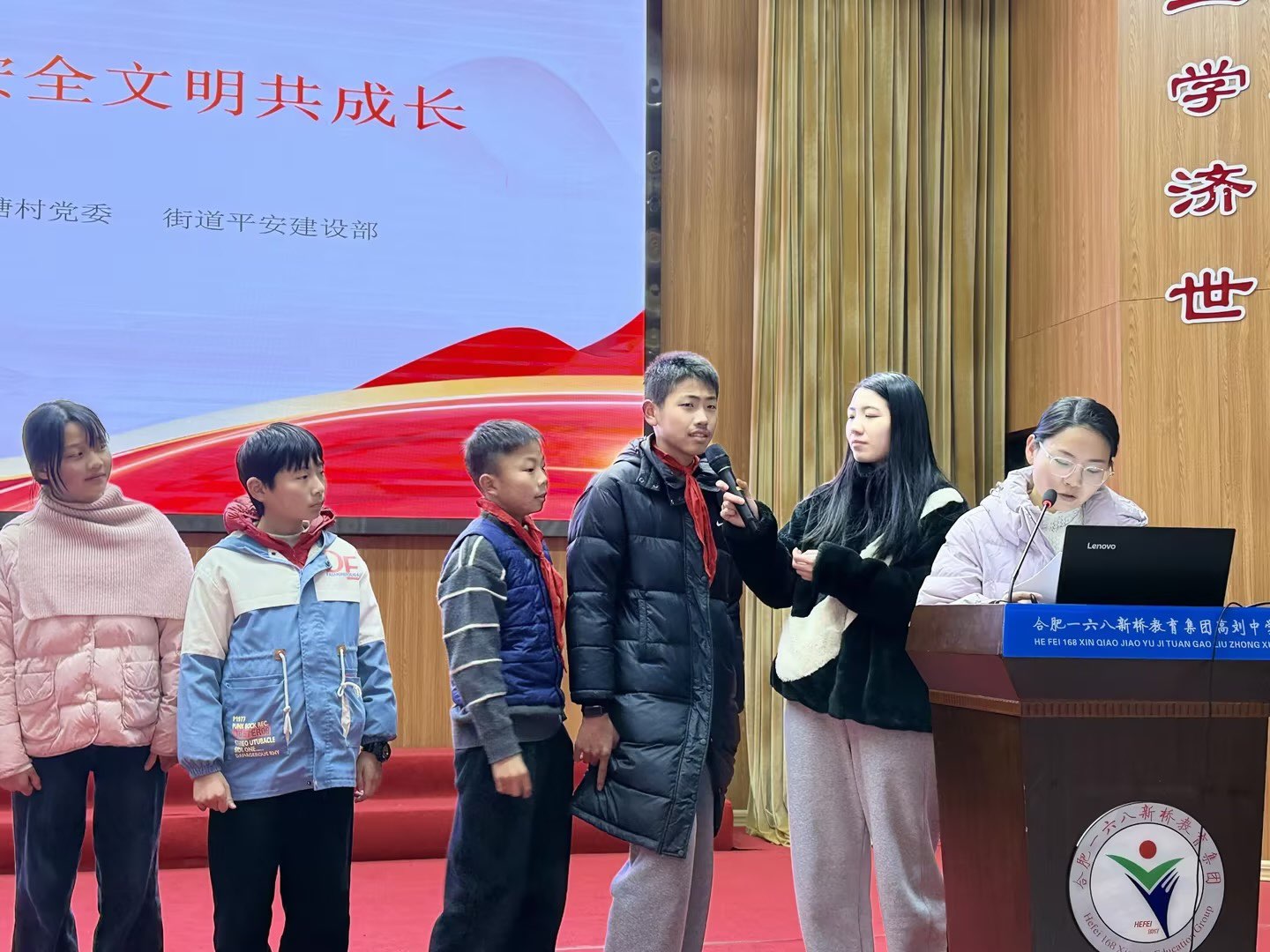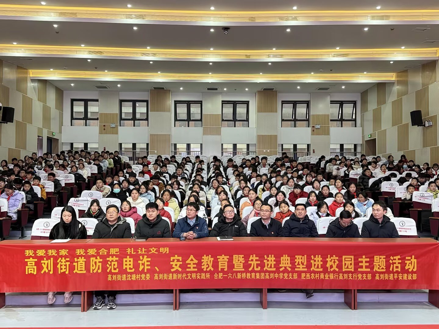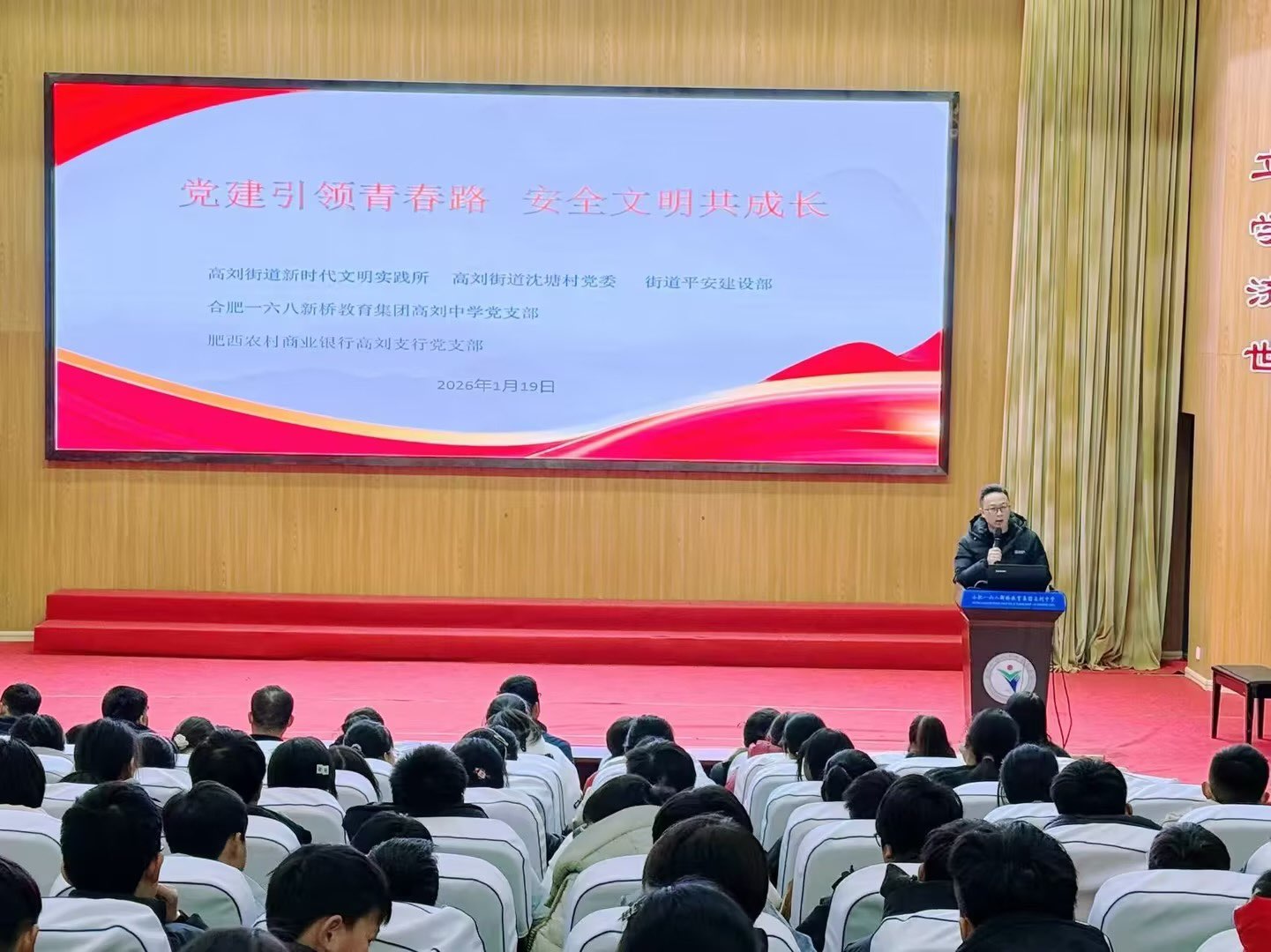 为深入贯彻落实国家、省、市关于校园安全工作的系列决策部署,紧密围绕《健全完善“985”工作体系促进中小学生健康成长的实施方案》(合教组【2025】14号)要求,切实将校园安全防线筑得更牢,全力保障师生生命财产安全和教育教学秩序稳定,1月19日下午,一场以“党建引领青春路安全文明共成长”为主题的防范电诈、安全教育暨先进典型进校园活动,在合肥一六八新桥教育集团高刘中学报告厅顺利举行。本次活动由高刘街道沈塘村委党支部、合肥一六八新桥教育集团高刘中学党支部等联合主办,旨在通过警示宣讲、榜样引领、互动体验等方式,为师生带来一堂贴近生活、触动心灵的安全教育课。现场师生、社区党员、民警及志愿者代表近300人共同参与。