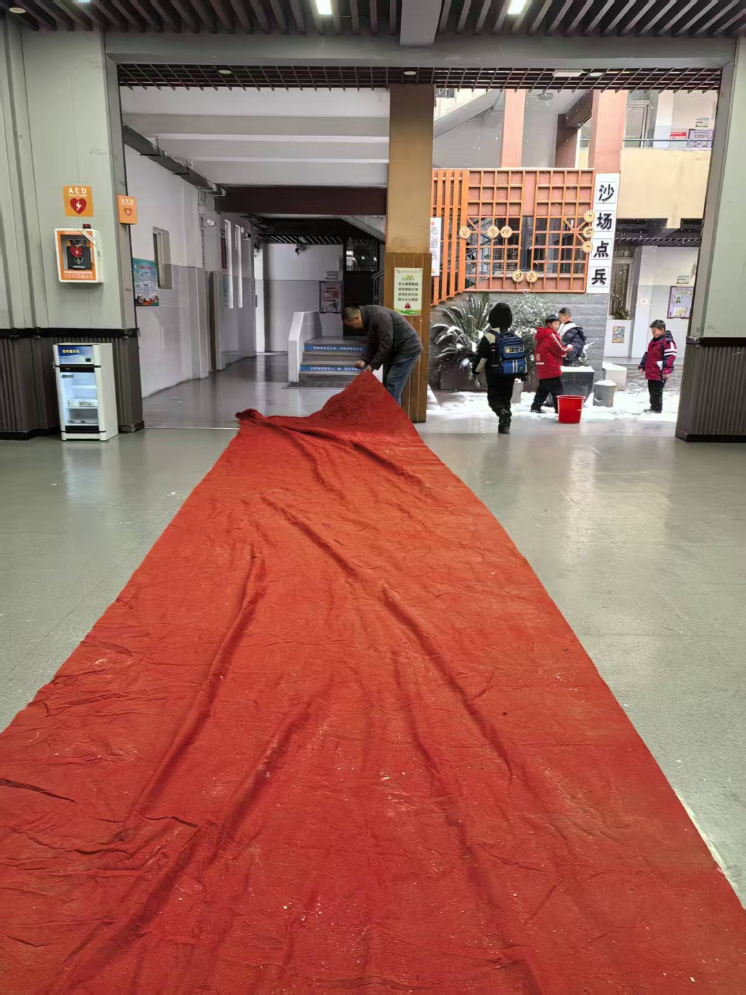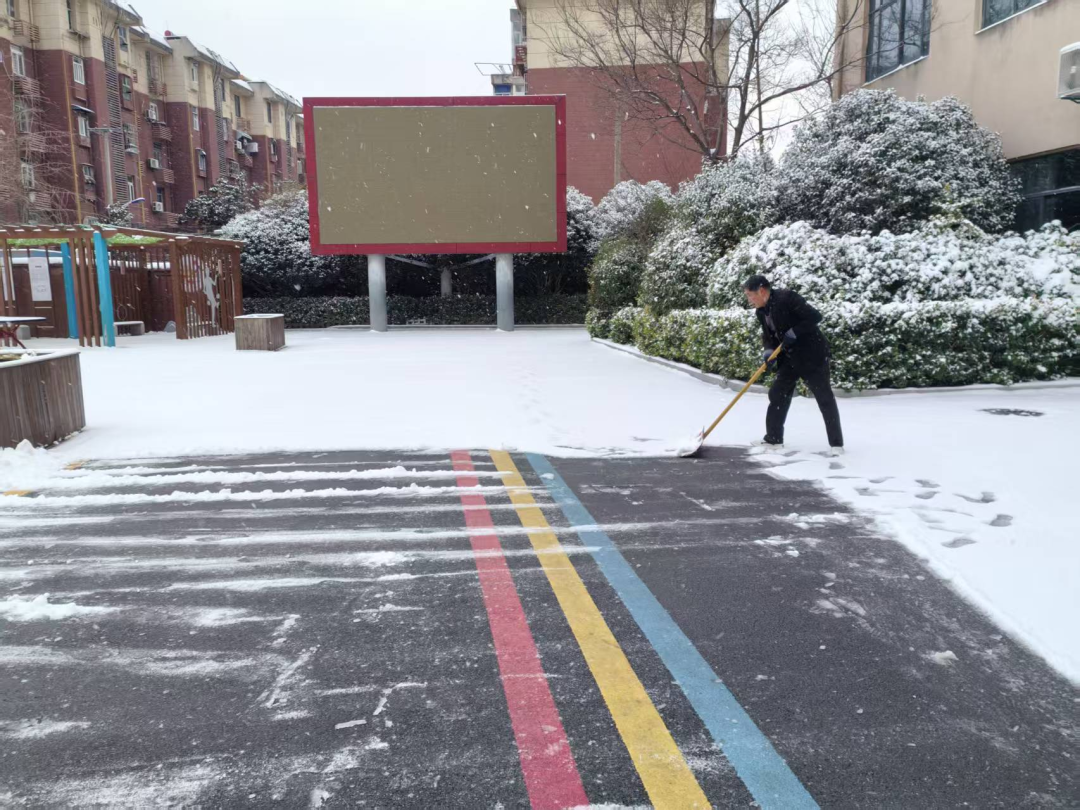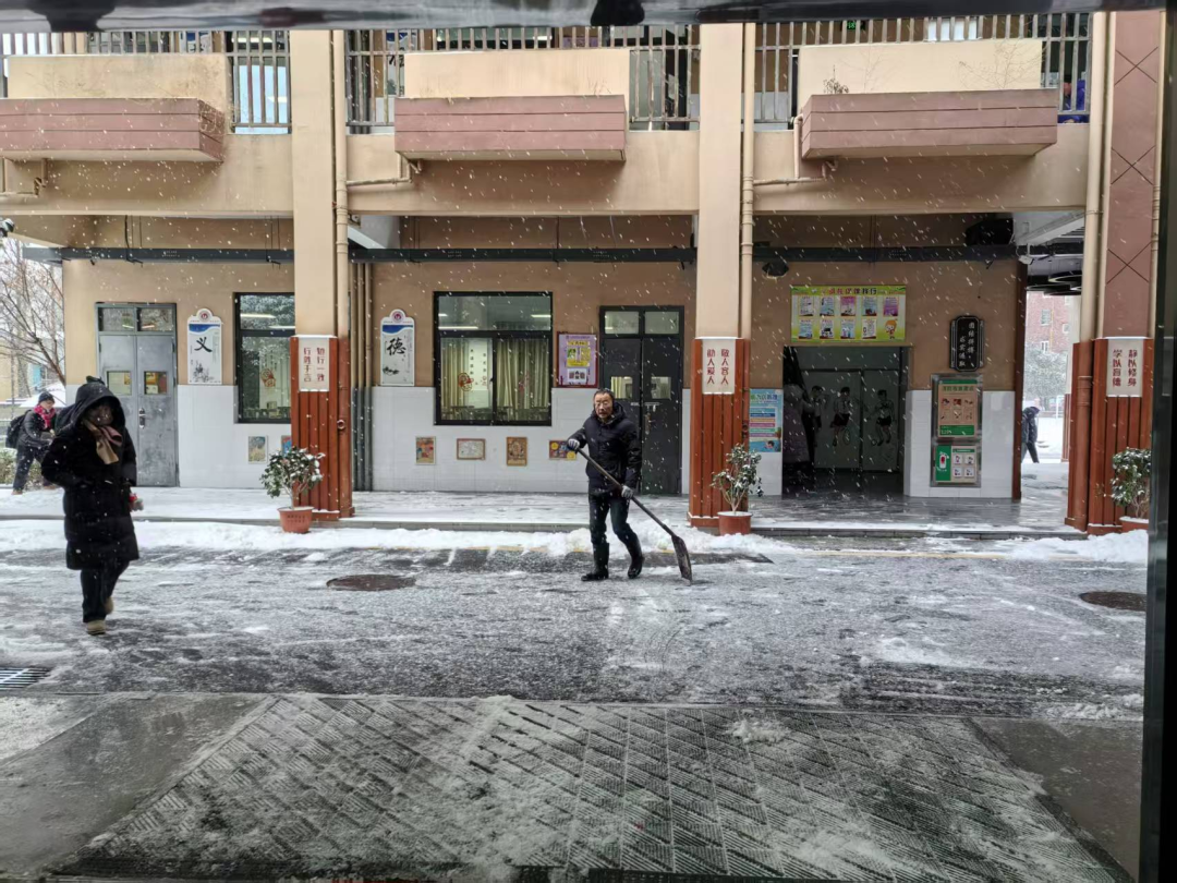 雪情即命令,学校后勤及教师志愿者火速集结,对校园主干道、教学楼出入口、楼梯台阶等关键区域集中除雪,同步在易滑处铺设防滑毯、张贴警示标识,打通校园安全通行路。