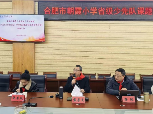 为扎实推进省级少先队课题研究,确保研究方向精准、实践路径明晰、成果转化有效,近日,合肥市朝霞小学举行省级少先队课题《少先队活动促进小学防欺凌教育的创新实践研究》中期汇报活动。本次活动特邀合肥市教科院少先队活动教研员戴厚文,省少先队名师工作室主持人、合肥市少儿艺术学校教育集团双龙分校校长沈来凤,合肥市少先队名师工作室主持人、合肥一六八玫瑰园学校校长助理舒会丽莅临指导。学校党支部书记、校长杨波,副书记吴学明,副校长周正林、卢凤玲全程参与,课题主持人程秀芳老师及全体课题组成员共同参会。