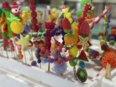 在“材料创意坊” 里,孩子们化身 “小小艺术家” 大展身手:用红色扭扭棒做出出圆润的“山楂球”,用黄色黏土捏出星星状的 “芒果块”,用画笔给卡纸圆片涂上渐变的“草莓红”,再用竹签将这些图形串成串。有的孩子用白色颜料点出糖霜高光,有的用亮片模拟糖丝的灵动,还有的给“糖葫芦”淋上了真材实料的 “冰糖外衣”。“我要让水果俏皮起来!”一年级的王梓涵大胆创新,用红色三角形做 “草莓小帽子”,搭配圆圆的黄色柠檬片当做可爱的小脸,添画几笔生动的表情,顿时让水果变得灵动又可爱!画笔游走时的线条把控,色彩碰撞时的灵感挥洒,粘土捏揉搓的匠心塑形,都是孩子们艺术表现力的生动展现。