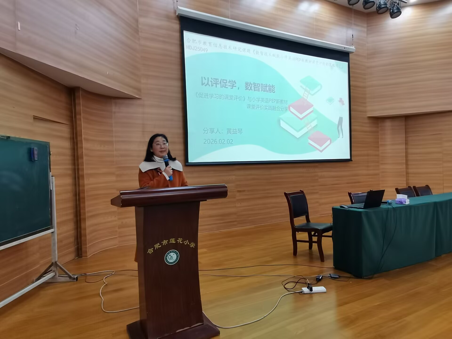 2026 年 2 月 2 日下午,合肥经济技术开发区小学英语学科期末教研工作总结会在合肥市莲花小学举行。合肥市建平实验小学锦绣校区课题《数智技术赋能小学英语 PEP 新教材课堂评价的策略研究》负责人之一黄益琴老师,作为区明珠人才教师代表,带来《以评促学,数智赋能——〈促进学习的课堂评价〉与小学英语 PEP 新教材课堂评价实践融合》专题读书分享,为区域英语教研注入新活力。