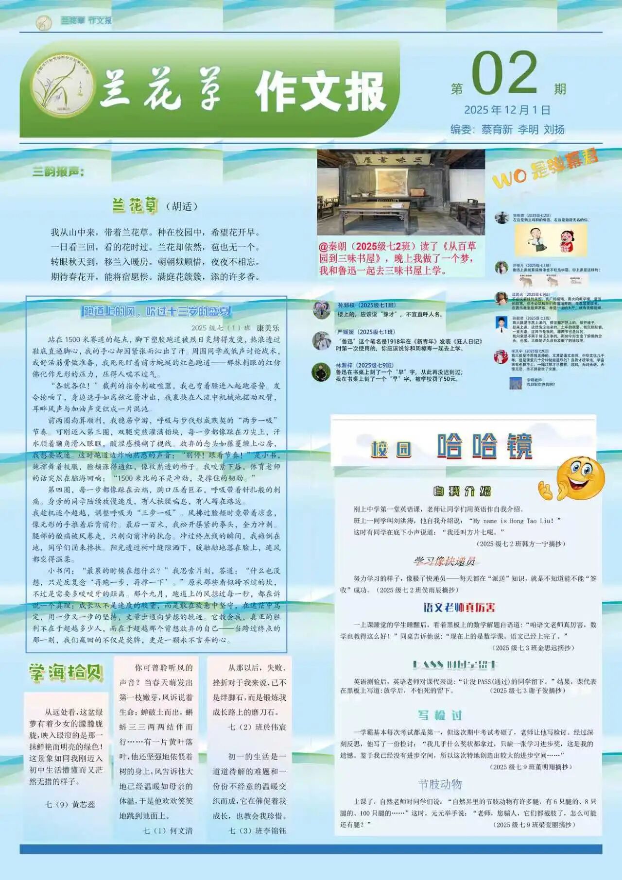 《兰花草作文报》创办:由蔡育新、李明、刘扬三位老师牵头创办《兰花草》作文报,精选学生优秀习作、名家散文赏析、写作技巧指导等内容,定期刊发传播,既展示了学生学习成果,又为师生搭建了写作交流的特色载体,成为备课组文化建设的亮眼名片。