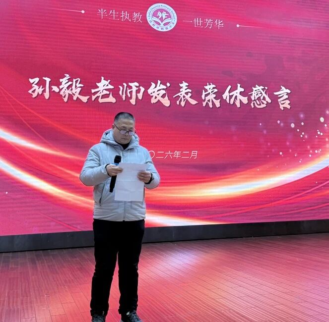 在全场热烈的掌声中,两位老师依次发表感言。张诗凯老师动情地说,在朝霞的六年多里,他深切感受到学校的温度与活力,领导的关怀、同事的团结都成为珍贵回忆,他祝愿全体教职工再创佳绩,学校越办越好。孙毅老师回顾四十余载教育生涯,感慨教育之路虽有辛苦,更有幸福与感动,他感谢学校与同事的支持,坚信学校必将迎来更灿烂的明天。