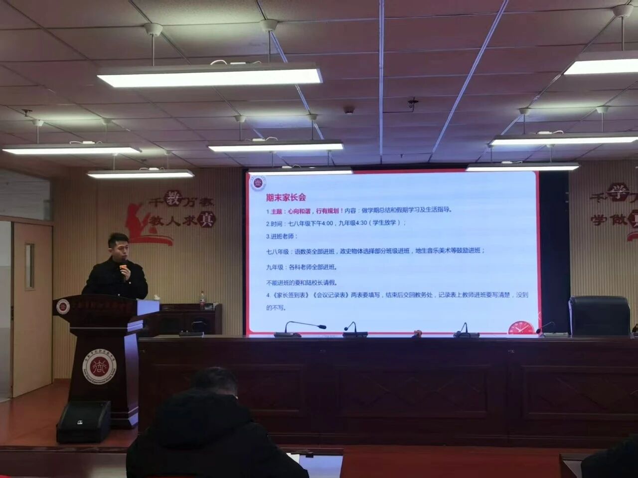 教务处负责人张志感谢全体同仁对教务工作的支持,明确寒假核心任务:统筹规划作业设计、推进学生综合素质评价、落实九年级理化生学科衔接;同时对于下午“心向和谐,行有规划”期末家长会做出细致要求。