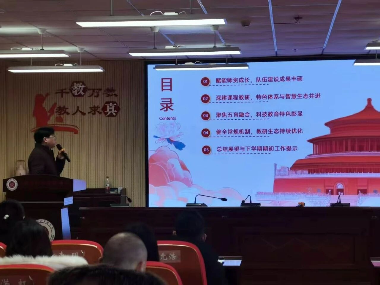科研处负责人孔铭从师资成长、课程建设、五育融合、常规教研四大维度总结工作,重点肯定了一学期来,全体教师在教学赛事方面、科技社团在特色建设方面取得的成绩,并围绕“十五五”规划明确深化智慧课堂AI+学科融合、升级校本课程、完善科创社团建设并推动加快课题研究为来年的工作重点,鼓励全体教师假期通过阅读,参与数字素养提升活动赋能自我。