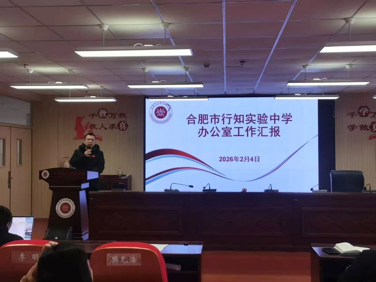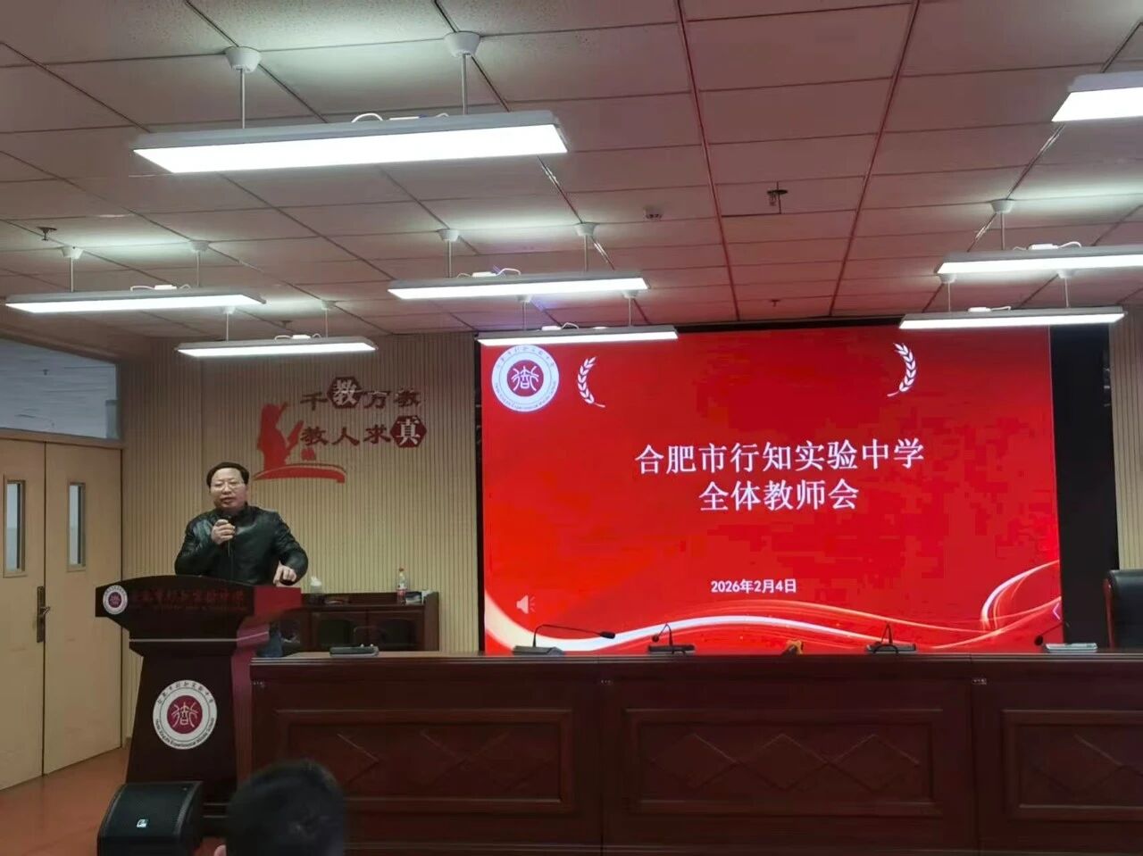 2026年2月4日上午,合肥市行知实验中学全体教师齐聚五楼会议室,召开期末全体教师会。会议由副书记、副校长张宗玉主持,围绕学期总结、寒假部署及新学期规划展开,议程紧凑、重点突出。
