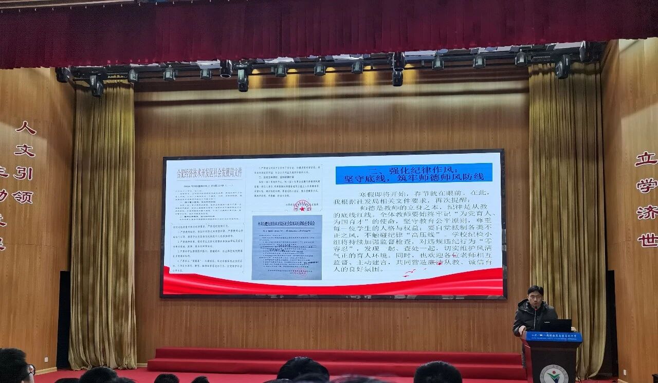 2026年2月4日上午,合肥一六八新桥教育集团高刘中学党支部纪检委员、副校长夏帮付在学校期末工会上组织党员干部和教师集中学习“社发局师德师风工作提示单(一)”和教育系统违反中央八项规定精神典型案例通报,用身边事教育身边人,深刻剖析案例背后的问题根源,引导干部职工知敬畏、存戒惧、守底线,要求大家切实把权力关进制度的笼子。