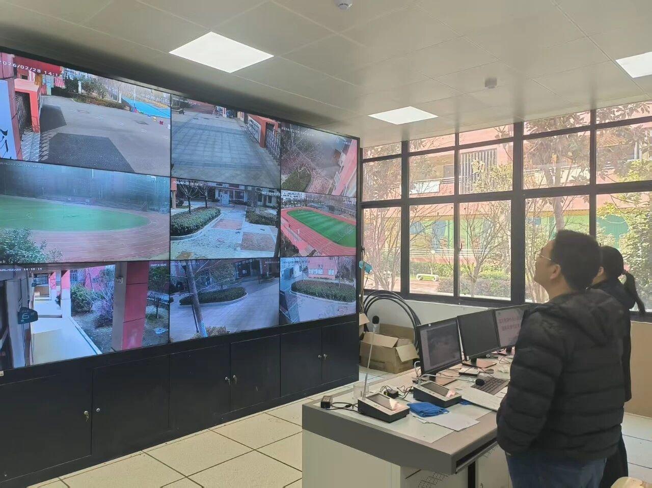 校园安保是安全防护的首要关口。在安保监控室,检查组工作人员凝神查看多屏监控画面,逐一核查校园出入口、教学楼、操场、食堂等重点区域的监控覆盖情况,仔细检查画面清晰度、设备运行稳定性,确保监控无盲区、无死角。同时,现场测试紧急报警按钮的灵敏度,检验安防设备联动响应效率,确保突发情况能够快速处置、有效联动,切实守住校园安全“第一道防线”。