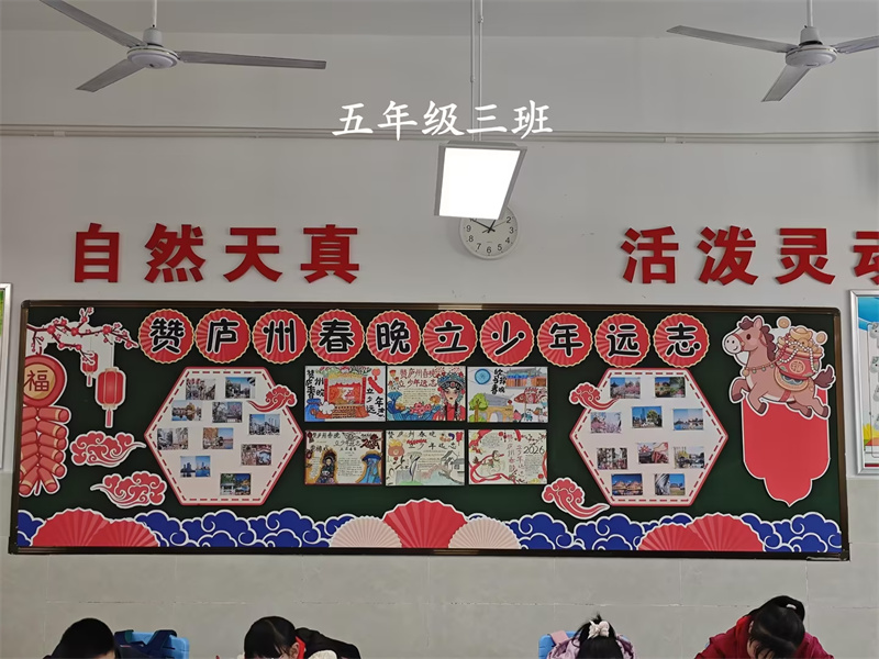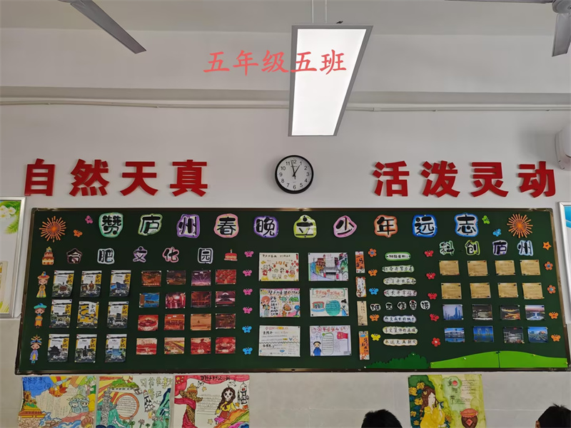 五六年级的黑板报则彰显了家乡情怀与少年志向。同学们以“赞庐州春晚 立少年远志”为核心,将庐州春晚的精彩瞬间、家乡合肥的人文底蕴与少年的梦想追求相结合,用文字赞美家乡的发展与变化,用画笔描绘少年的奋进姿态。